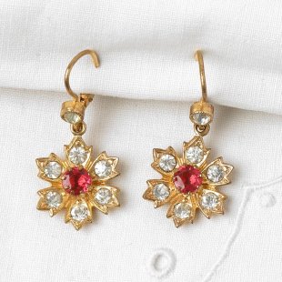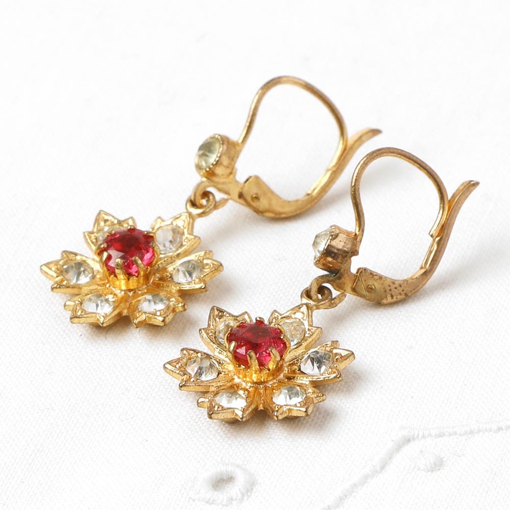こちらは1920-30年代頃の大変古いヴィンテージピアスです。こちらはデッドストックの未使用品として入荷しました。保存状態が良く金属の劣化のほとんど見られないデッドストックです。薄い金属台座は、そのままお花の形、花びらの上にはカットガラス、雄蕊の中央部分にはレッドのカットガラスがあしらわれています。装飾は繊細で大変美しいものです。ちょっとアールデコなスタイルも感じさせます。さまざまなシーンでお使い頂ける素敵な年代物。(ほとんどアンティークのお名です。)たれの部分がキラキラと揺れ、カットガラスがキラキラと光を放ちます。金属は柔らかいので取り扱いにはご注意くださいませ。