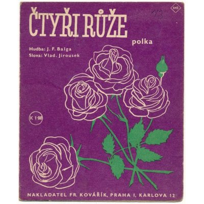 こちらはとても古いチェコの楽譜、1948年の古いものです。例えば居酒屋で演奏していた音楽家などが購入していたとか。「4本のバラ」(仮題)という題名で1943年に作曲されたポルカ音楽です。庭に4本のバラがあって、3本は咲いたが一本は枯れてしまった。」と言うメランコリックな内容の歌詞が書かれています。曲はJ.F.バルガという作曲家が書いたものです。表紙の絵はチェコのグラフィックデザイナーのもので、レトロでチェコらしい素敵なデザインかと思います。経年の風合いがあります。紙は薄いもので繊細なものです。古いものという事をご理解の上ご購入をお願いいたします。