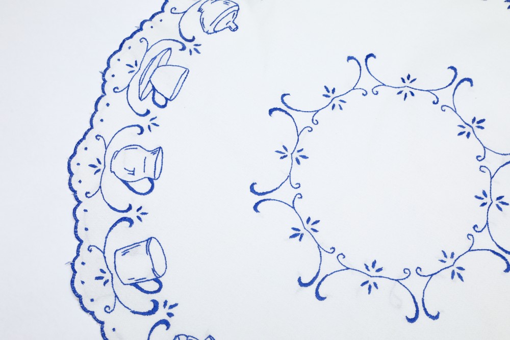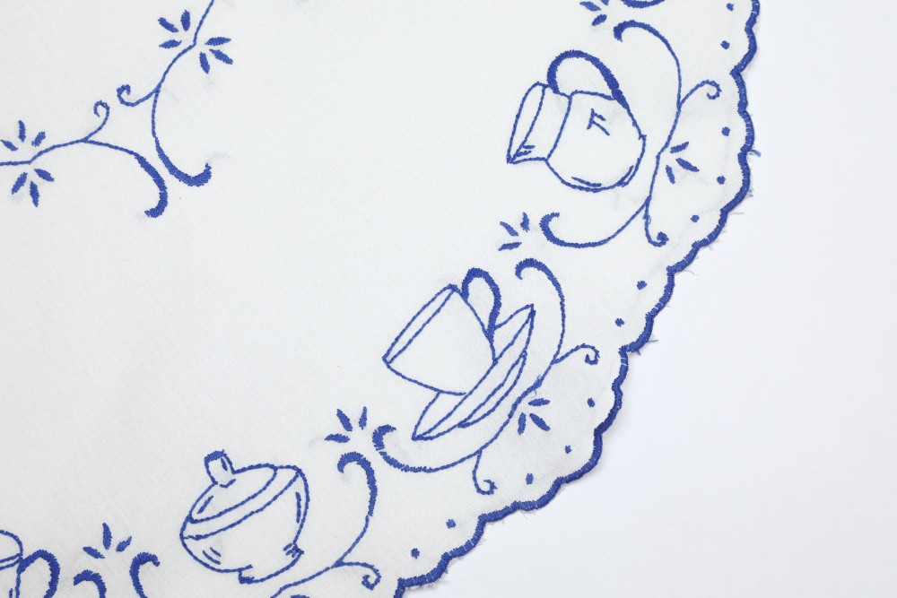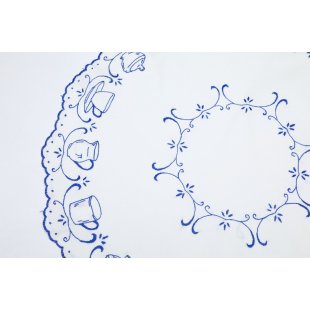 こちらは20年前にお邪魔したチェコの田舎のお宅に住んでいらしたお婆様からお譲りいただいたテーブルクロスです。彼女が若い頃に手刺繍を施したクロスの中からの一枚です。白い厚手のコットンに、青い糸でティーカップやシュガーポットなどの刺繍が施されています。直径は74cmです。木製のテーブルにブルーのカラーがよく合って空間を素敵に演出できます。一つひとつ丁寧に刺された針仕事の温かみをお楽しみ頂けます。目立った汚れなどなく、保管の良かったようで状態も良いものです。