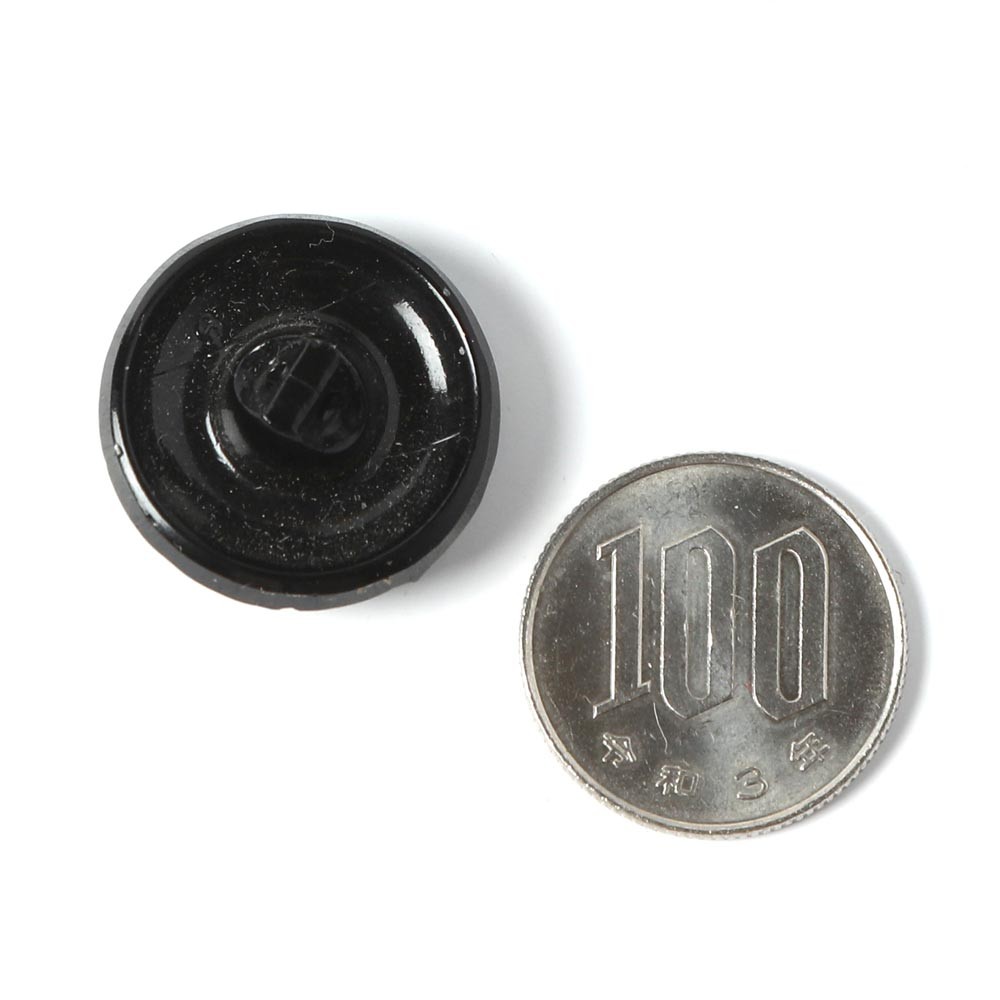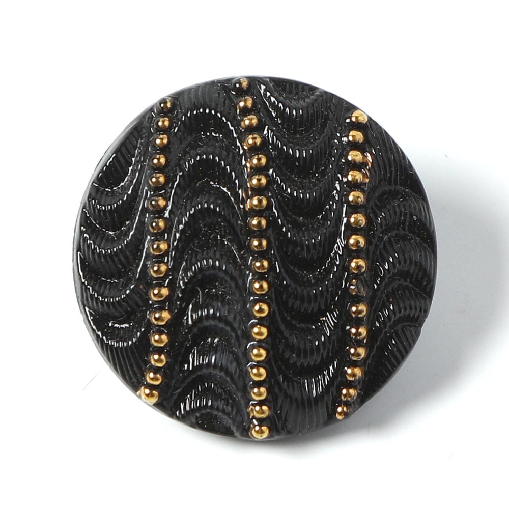 こちらはガラスボタンの見本帖に縫い付けてあったガラスボタンです。1990年代頃の見本帖で比較的新しいものです。黒いカラスを使用したボタンでぽっこりとした形、表面は波打つような模様が施され、ゴールドの細かなドットのラインがアクセントになっています。シックな雰囲気が魅力的です。私の手元に一つしかないボタンで、コレクションの中に保管していたボタンです。状態も良いものです。セルフシャンクのボタンです。