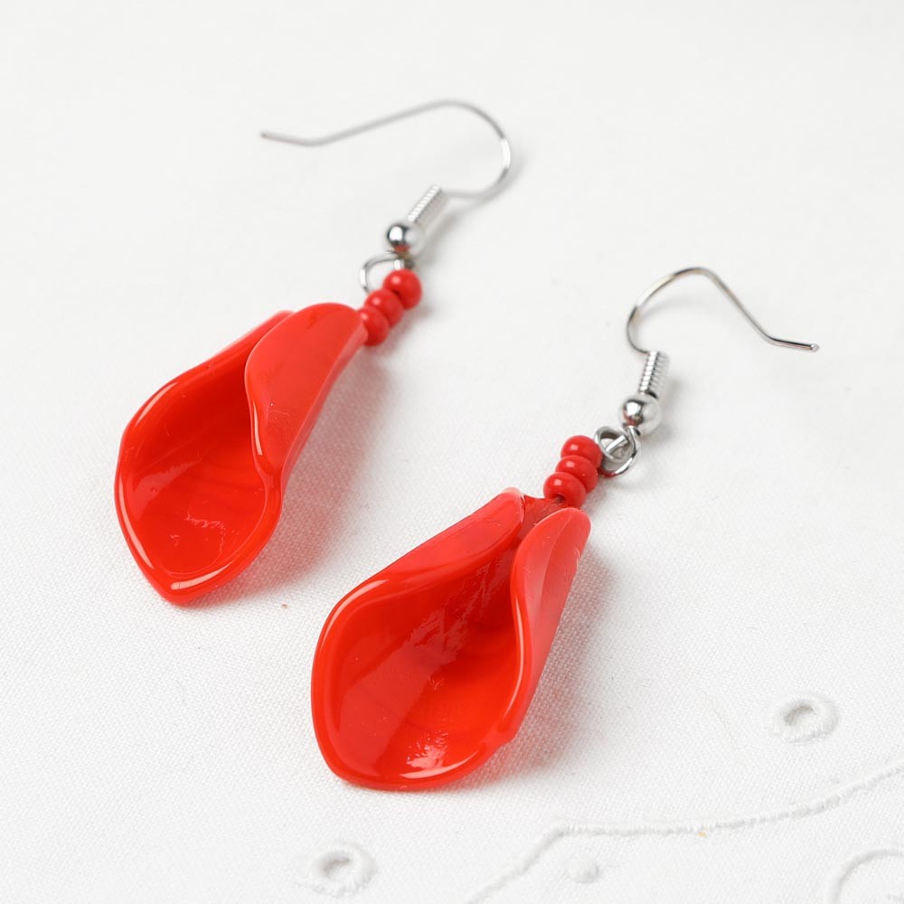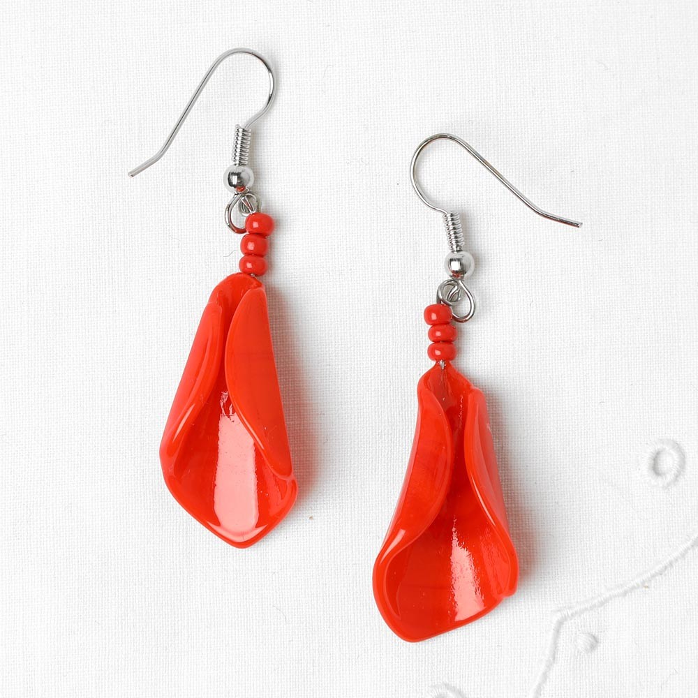 こちらはチェコのガラス職人さんが作ったガラスのピアス。丁寧な手作りです。こちらは赤いカラーのお花がモチーフになったお品です。耳元で揺れ、パッと目を惹く華やかさがあります。ガラスの国チェコからの良品です。