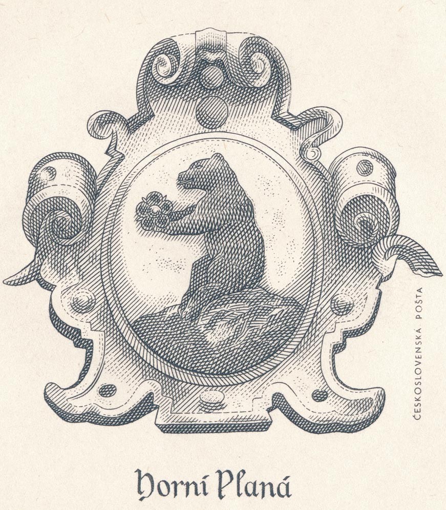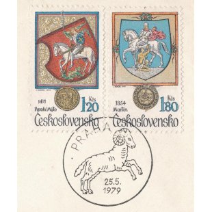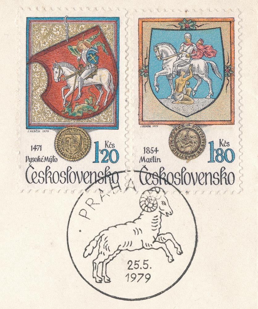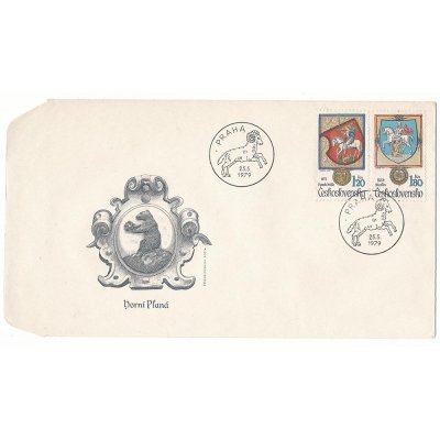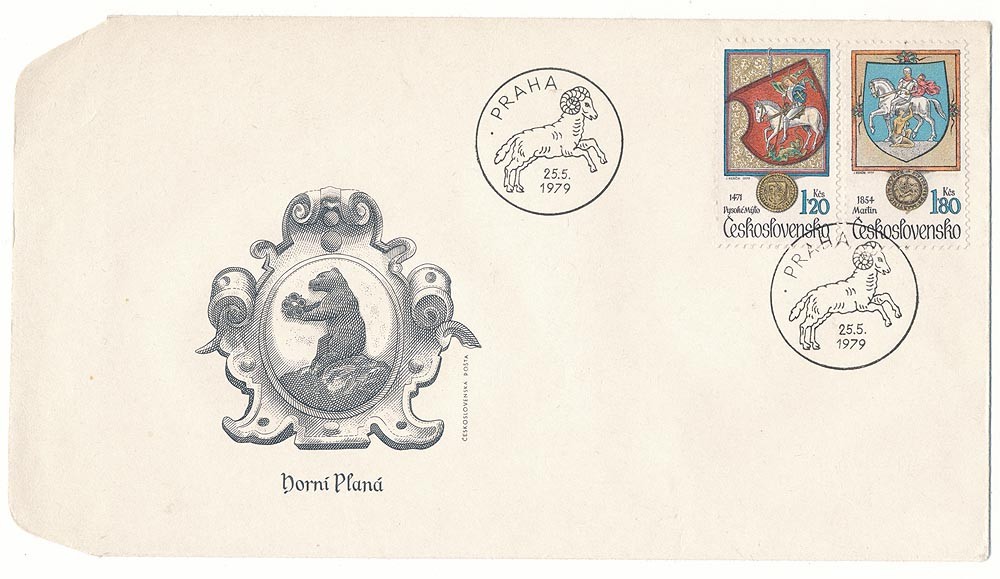 こちらはチェコスロヴァキア1979年のFDC封筒でホルニー・プラナーをテーマにしたものです。ホルニー・プラナーは、チェコ共和国の南ボヘミア地方のチェスキー・クルムロフ地方にある町です。封筒の左には街の紋章である熊とイヌバラの紋が凹版印刷でプリントされています。白馬の騎士の紋章の切手も貼られています。山羊の印も可愛らしいデザイン的にも優れたお品です。