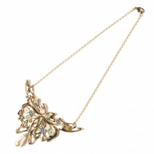 ちょうど鎖骨の下に収まるぐらいの長さです。金属の流れる曲線、パステルカラーのお花と大きめの雫型パールが美しい逸品です。
