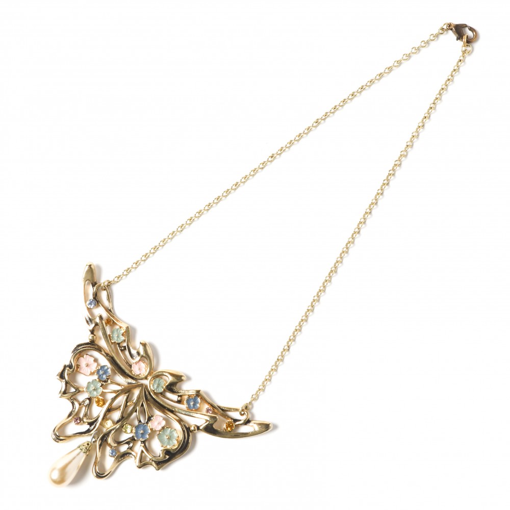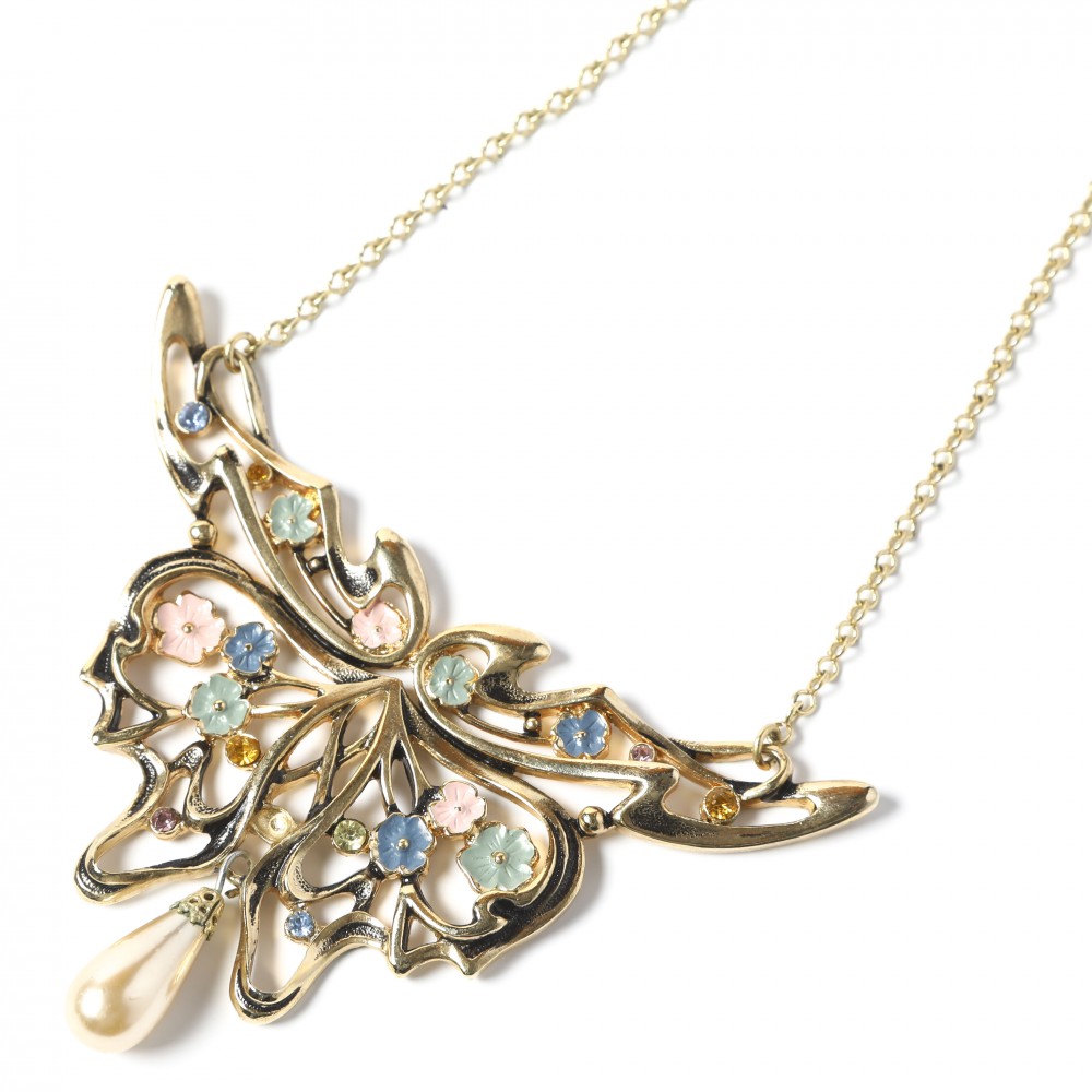 バーボフカが長年かけて集めてきたとっておきのお品をご紹介です。こちらはチェコの得意分野セセッション(アールデコ)スタイルを踏襲してで80年代に作られたネックレス。こちらのガラスの街ヤブロネツのジュエリー工房からの物です。長さが10cmもある大きな蝶々のモチーフがセセッションの曲線スタイルでデザインされた豪華なネックレスです。全体の長さは44cmですので、首の下、胸元に収まります。当時ダンスパーティーなどでチェコの女性に愛用されてきたスタイルの、クラシックなアールデコ・ネックレスです。今となっては貴重なチェコの逸品です。