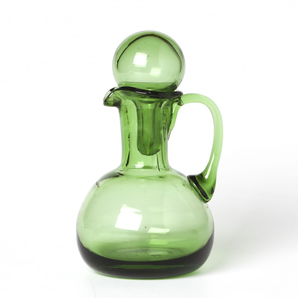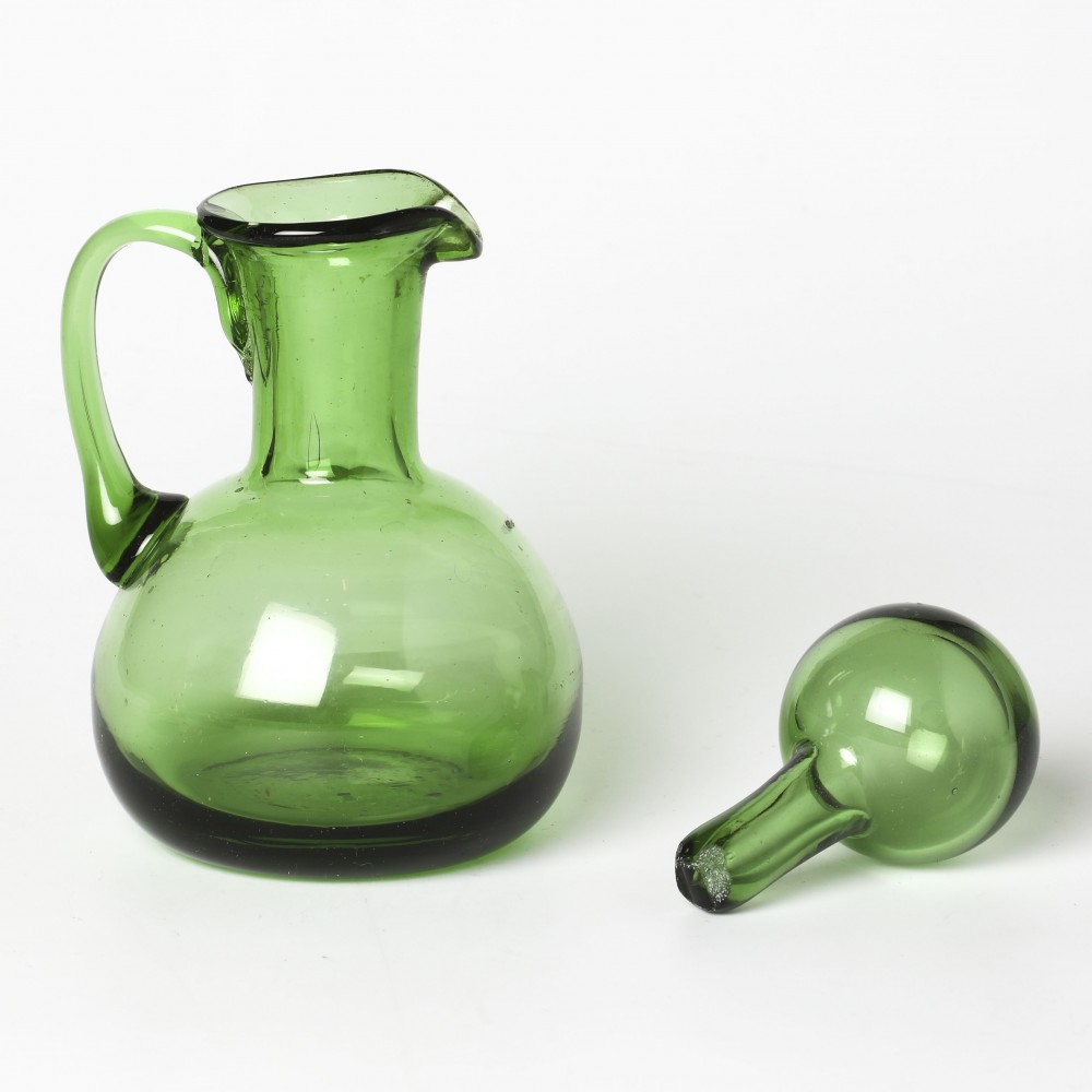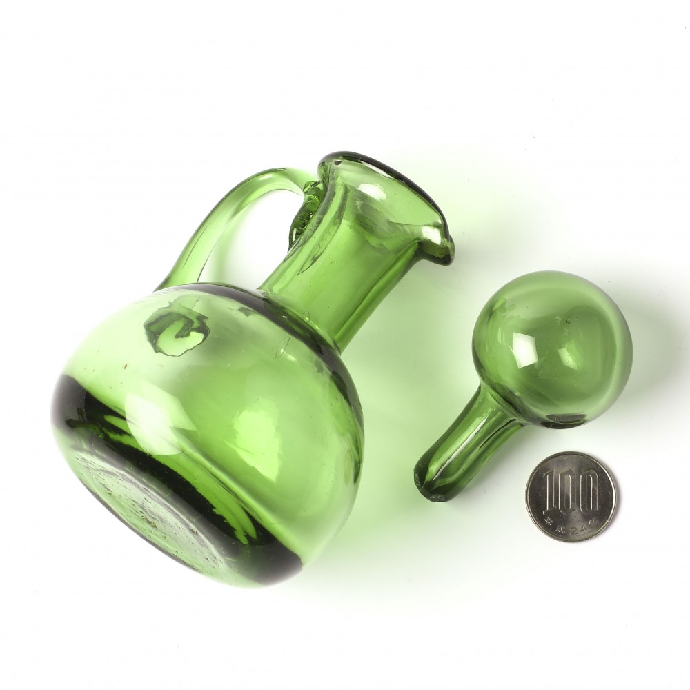 こちらはチェコスロヴァキア時代のガラス工芸品の水挿し。吹きガラスで職人さんが作ったものです。20年前にアンティークショップで入手して以来、当店で長く保管されていたお蔵出しです。熟練した職人さんらしく、水差しの栓までガラス製です。店長横山、透明の緑色のガラス大好きです。水差しやビネガー入れなどに使えますが、インテリア雑貨として使えるほど、格好の良いバランスの取れたお品と思います。またお花を活けたりするのも良いかもしれません。底の部分に不純物が入っています。またガラスには気泡も入っていたりしますが、製品としては問題のないものです。内部には汚れなどありません。チェコからのとっておきです。