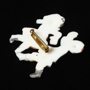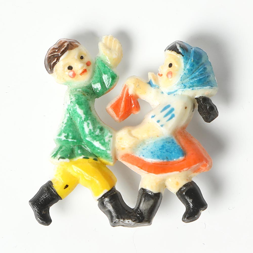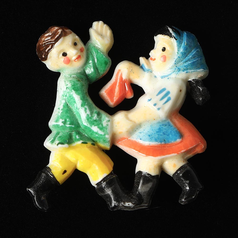 こちらはチェコスロヴァキア時代の子供用のブローチ。プラスチック製です。男の子と女の子がダンスを踊るシーンがブローチになっています。男の子の掲げた手や、女の子のハンカチーフを振る手などの描写が細かく、色使いも素敵な楽しいブローチです。このようなプラスチック製のブローチはチェコ・レトロファンの間でもノスタルジーを誘う人気アイテム。遊び心いっぱいのキュートなブローチです。ほとんどアンティーク、1930年頃の貴重なコレクターズです。バーボフカのコレクションからのご紹介です。後ろのピンの状態も含めてとても状態の良い一品です。