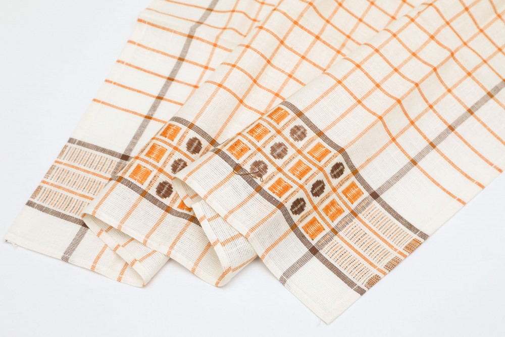 こちらはチェコスロヴァキア時代のキッチンクロス。デッドストックの未使用品です。社会主義時代のリネン製品の国営企業TEXLENからのお品です。(残念ながら中国製などのリネン製品に押され、2007年に閉鎖、今では存在しない会社です。)白地にオレンジとブラウンのライン、またコーヒー豆のような模様の入ったレトロで可愛いクロスです。麻の量が多いようでパリッとしたリネン特有の硬さがあります。使えば使うほど味と吸水性が出てくる優れものです。50x 70cmと割と使いやすいサイズで台所仕事に活躍してくれそう。もちろん台所にも明るい彩りを添えてくれます。布の上部にはフック用のテープも縫い付けられています。長く愛して頂けるチェコの素敵なレトロ商品です。