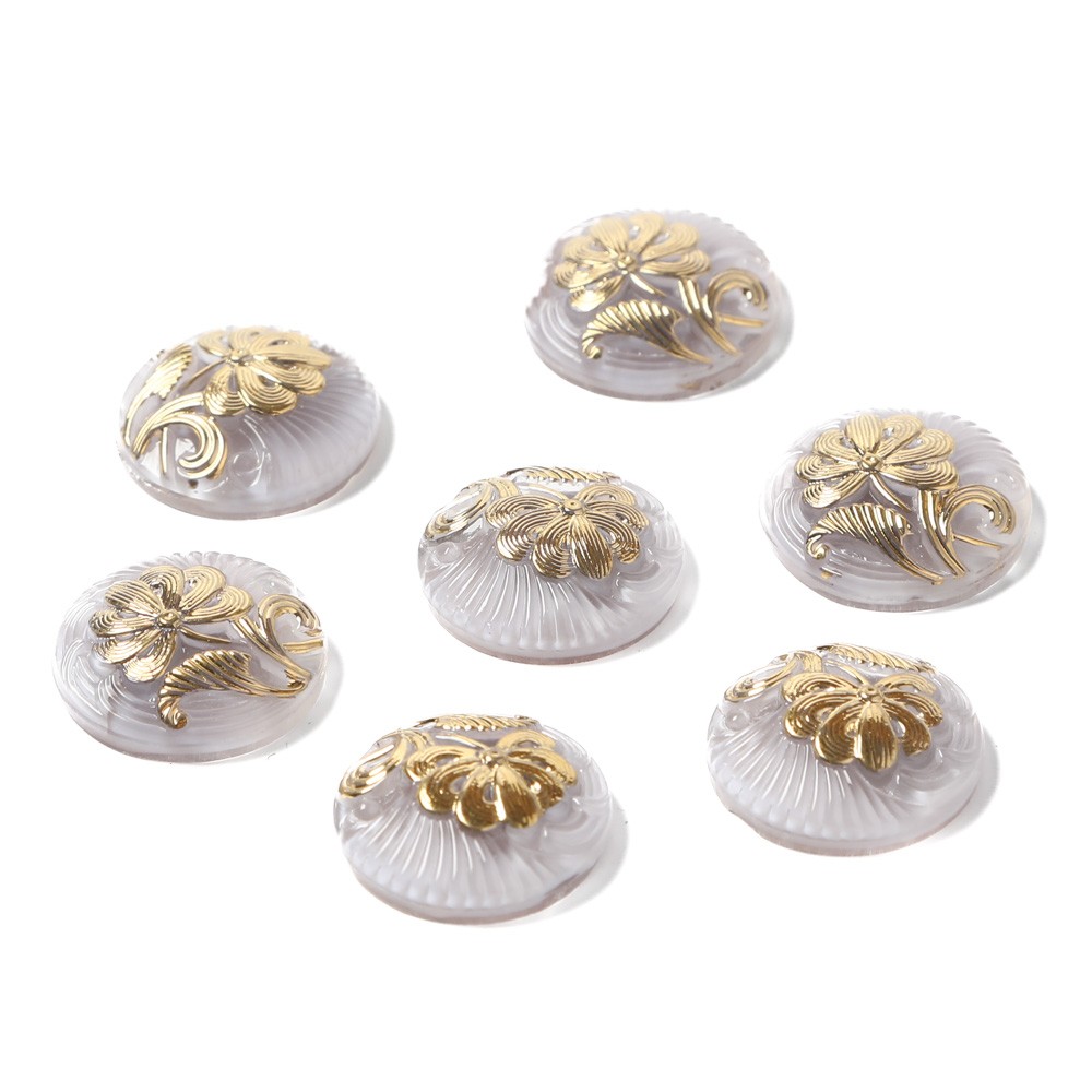 こちらはチェコのガラスボタン工房で製作されている手打ちのガラス・カボションです。直径が約1.8cmあります。淡いパープルとクリアのマーブルの入ったガラスを使用し、表面には優雅なお花のモチーフがゴールドで施された美しいカボションです。大人っぽく優しい雰囲気の仕上がり。こちらは1個売りの値段です。ガラスボタンと同じデザインですが、ボタンではありません。裏には糸通しのリングがないため、アクセ・パーツとして使用される方には大変便利です。
