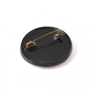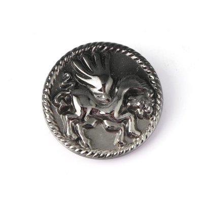 こちらはチェコガラスのペガサスのブローチ。直径 3.4cmとかなり大きめのブローチです。ジェットガラスが使用され、その上からシルバーの金属塗料が塗布されています。部分的な吹き付けでブラックとのグラデーションになっております。大きめでまた、厚みがあり独特のセンスが漂います。このタイプのガラスのブローチはガラスの国チェコ特有の物です。かつては(60年代くらいまで)割と見られたデザインですが、いまではなかなかお目にかかれなくなりました。優しい雰囲気で大きめですのでスカーフ留めなどにちょうどいいアクセントになります。また帽子などにもおすすめ。円の周辺には綱のような装飾が施されています。チェコならではの日本にはないなかなかハイセンスなブローチかと思います。