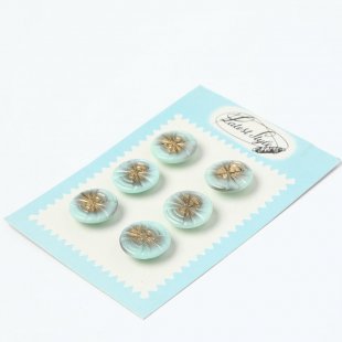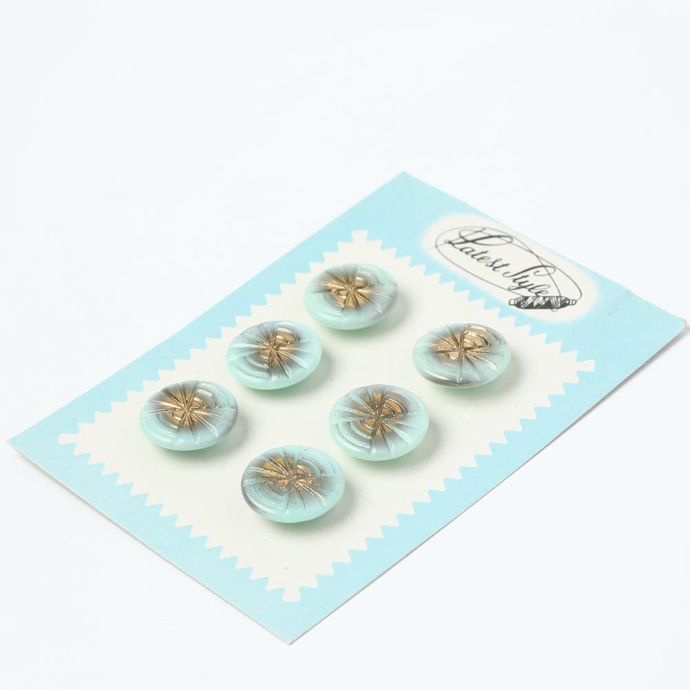 こちらはチェコスロヴァキア時代のヴィンテージガラスボタンカード。最新ファッションと名前のついたシリーズのカードで1.8cmの直径のボタンが6個のボタンが縫い付けられています。ウランガラスを使用し、クリームグリーンの厚みのあるボタンで表面には吹き付けで金彩も施されています。レトロスタイルの可愛らしいボタン。カーディガンのボタンなどにおすすめです。チェコでも貴重なヴィンテージのガラスボタン。現在ではもう製造されていないヴィンテージです。