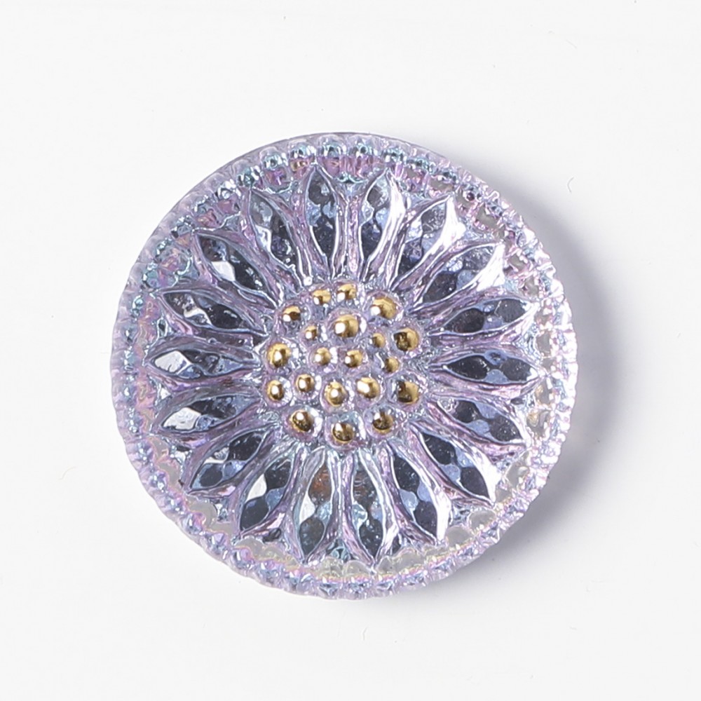 こちらはチェコのガラスボタン工房で製作されている手打ちのガラスカボションです。直径が約1.8cmあります。打ち出しや彩色も職人さんの手作業で行われています。ひなぎくのモチーフで裏から金属塗料が塗布され、奥行きのある人気のヴィトレイル・カラーです。パープルが強めですが、クリアブルーのお色も見え隠れします。おしべには手作業で金彩も施され、柔らかな雰囲気のフェミニンな一品です。複数写っている写真もありますが、こちらは1個での販売になります。こちらはカボションですので、裏面はボタン通しがなく、平らですのでアクセサリー作りの材料としては便利かと思います。