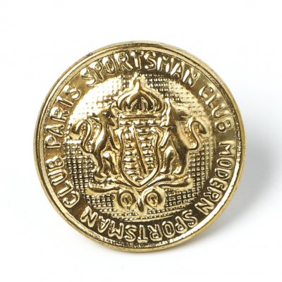 こちらはチェコスロヴァキア時代のヴィンテージ・メタルボタン。錫(すず)製の高級メタルボタンで、ゴールドのお色。ティサーのメタルボタンの歴史は古く18世紀後半にまで遡ります。今でも職人さんが一つ一つ手作業で制作しているボタンです。こちらでティサーのメタルボタンの記事もご覧いただけます。こちらは、表面にヨーロッパの王家の紋章をあしらったノーブルでクラシックなメタルボタンで周りにはスポーツマン・クラブ・パリと印字されています。黄色味の強いクリアゴールドのお色。1960-1980年代頃までのヴィンテージボタンです。状態もとても良いものです。中間空洞ですので、水洗いの洗濯はお勧めしません。洗濯される時は洋服からはずされるのをお薦めしています。ティサーのメタルボタンはとても軽く、アクセサリーのマテリアルとしてもおすすめです。