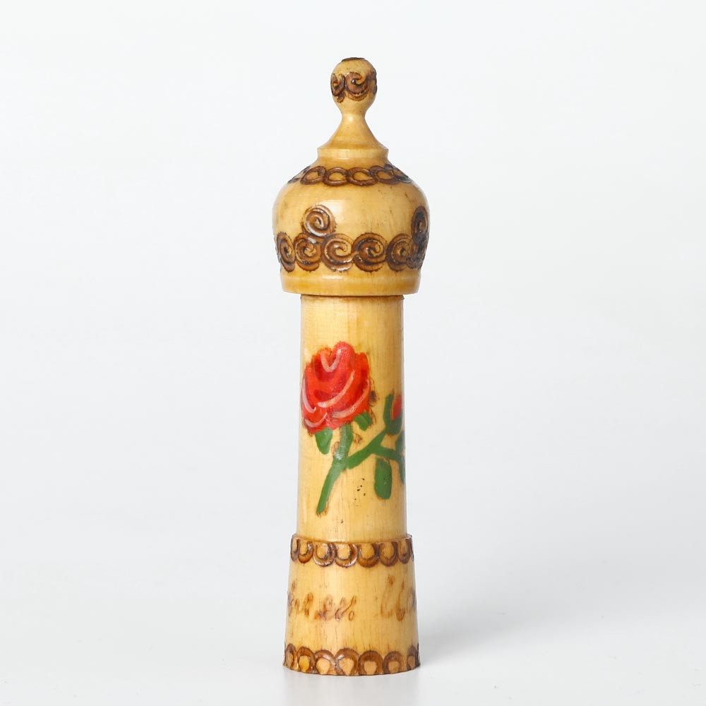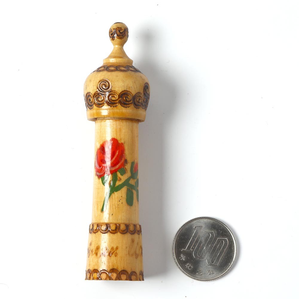 こちらはブルガリアの民芸品、木製の香水入れ。チェコのアンティークバザールで入手です。中には小さな薔薇の香水瓶が入っていて香水として売られている民藝品。こちらは香水の瓶は入っておりません。焼けた針のようなもので手描きで施された模様が入っていて、こちらは大きな一輪のバラが描かれています。表面にはうっすらとニスが塗られています。お裁縫のお針入れとして使うとお裁縫箱が楽しく演出できます。小さいながら手作りの暖かさが感じられる木工民藝です。とんがり帽子のぽっちもなかなかキュート。蓋も割と滑らかできちんと閉まります。全体の状態も良いものです。