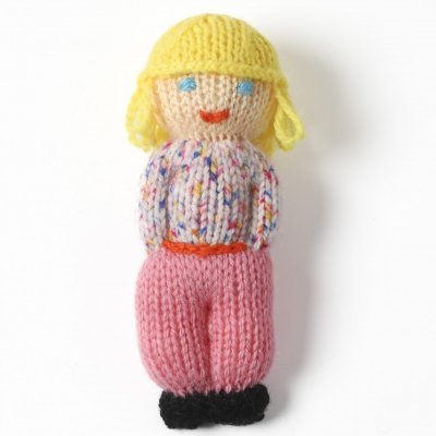 こちらは編み物で作ったお人形。チェコでは今、昔あった家庭のアートがちょっとした人気です。作家の大きな作品ではないけれど、家庭で作成された手作りのアイテムは、チェコでは昔社会主義時代に物資が豊富ではなかったこともあり、昔からなかなか深みのある分野。こちらのお人形さんは家庭の主婦ヘレナさんが新しく編んだ少女のお人形です。今回はブロンドで瞳はブルーのおかっぱの女の子です・・・。オレンジのお口でにっこりおっとりした幸せな表情が素敵です。ピンクがお好きなのか、ズボンもセーターもピンク。とても愛らしいお人形です。