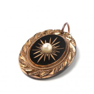 こちらはチェコスロヴァキア時代のヴィンテージ・ブローチ。黒ガラス(ジェットガラス)を使ったクラシックなデザインのペンダントヘッドです。ジェットガラスは現代では使用できない特殊な薬品を使用していて、黒の濃度が通常の黒いガラスと比べて高く、漆黒の色をしています。太陽の光も通さない黒です。現在では作れないガラスで世の中に残っているだけ・・・。ずばり貴重なお品です。表面には光を放射する太陽なようなモチーフが彫りで施され、中央にイミテーションパールが配置されています。周辺の楕円のフレーム部分の装飾も繊細で美しいものです。表面を研磨したのち、手作業で金彩が施されていて、作業にもなかなか手間がかかっています。ノーブルな雰囲気の豪華なペンダントです。ゴールドの塗料に少々焼けが見られます。ガラス部分の縦の長さは4cmと大きめですので、実際に着用されるとパッと人目をひく存在感があります。近年ではなかなか入手の困難な1950-60年代の良品ヴィンテージです。