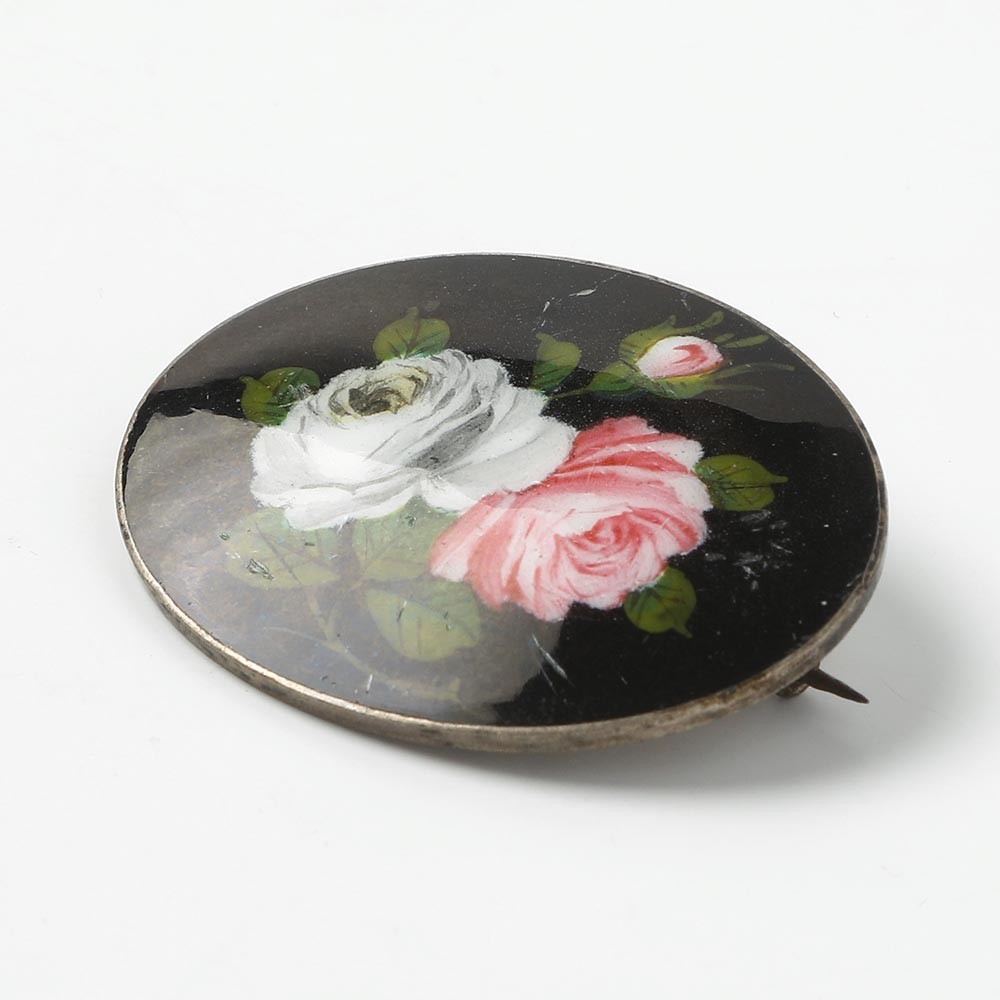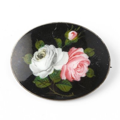 こちらはアンティークのエナメルのブローチ。ヴィクトリア時代(1830-1900)の大変古いアンティークです。楕円形で表面には黒地に白とピンクの可憐な薔薇が大変細かなタッチで手描きで描かれています。描画が繊細で美しく、近年市場にあまり出ない見事なブローチかと思います。目立った傷やかけもございません。こちらヨーロッパでも人気のコレクターズ・アイテムです。