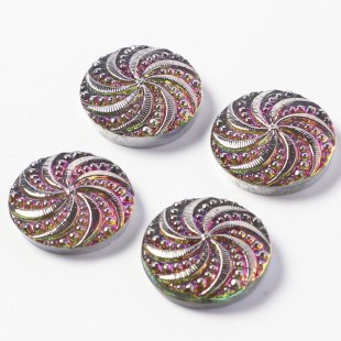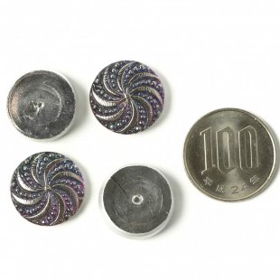 こちらはチェコのガラスボタン工房からのカボション。この度は4つでのセットです。渦巻きの模様のカボションで、裏から金属塗料が塗布されピンクパープルのお色です。角度によってはグリーンのお色も見え隠れします。渦の部分はシルバーです。角度によって様々にニュアンスを変えます。