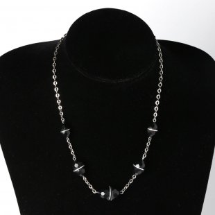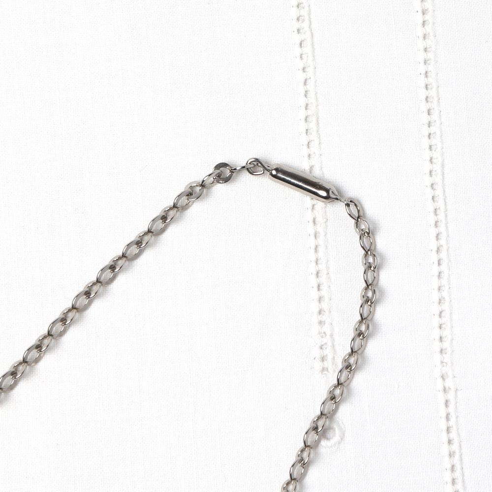 こちらは、チェコスロヴァキア時代1930年のヴィンテージ・ネックレスでガラライトのビーズが使用されたネックレスです。ガラライトはミルクプラスチックとも言われ、牛乳のタンパク質から作られるプラスチックの一種で、柔らかな風合いとあたたかみがあります。ガラライトのアクセサリーやボタンは日本の方にはそれほど馴染みがあるわけではありませんが、ベークライトと並び、ヨーロッパやアメリカなどにコレクターが多く存在する人気のヴィンテージアイテムです。ココ・シャネルも初期のコレクションにガラライトのアクセサリーを使っていたことも知られています。こちらはブラックのガラライトのビーズで楕円形の中央で切断されたようなデザイン。その中央には金属パーツが挟まれています。ビーズの表面には面取りが施され、無駄のないキリッとした美しいデザインです。当時のアール・デコデザインの一品で、シックで洗練された美しいお品。デッドストックで入手したもので、状態は素晴らしいものです。コレクターズアイテムでこちらでも貴重な一品です。