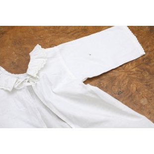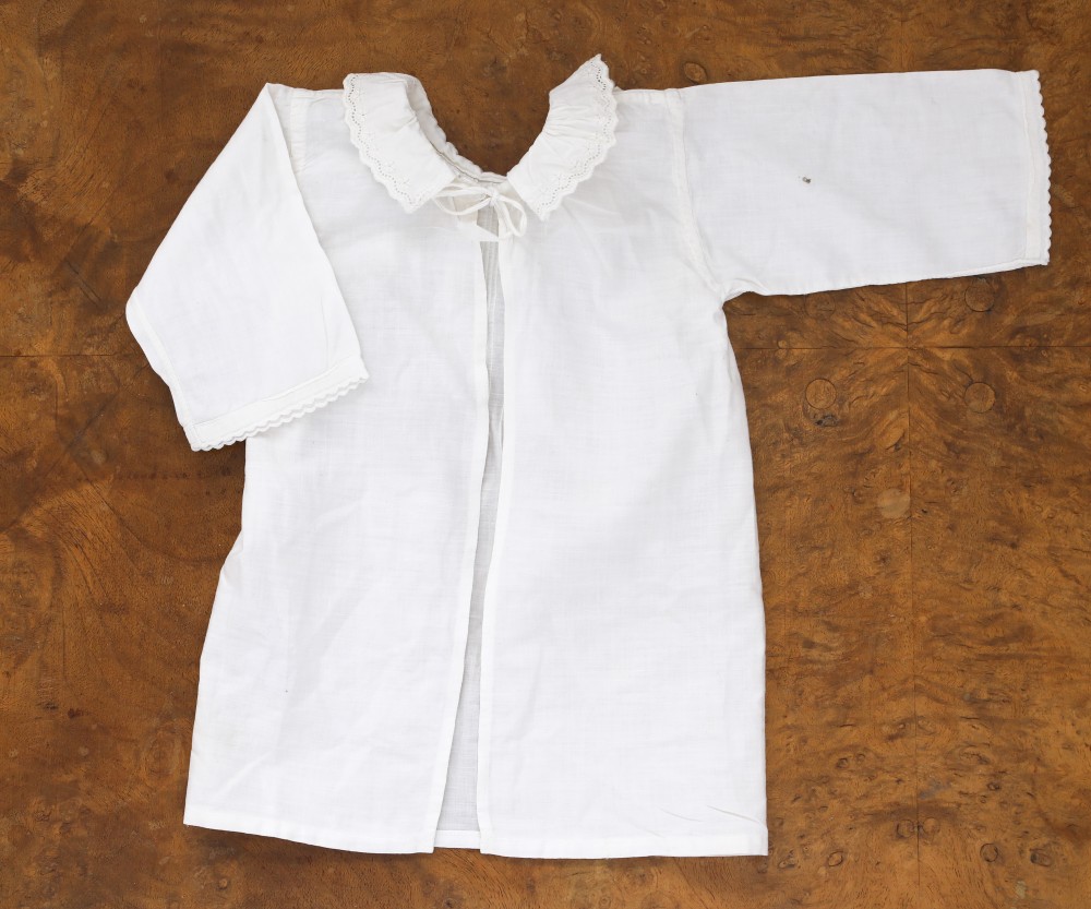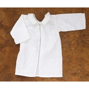 こちらはチェコのアンティークショップで20年前に入手のベビー服です。薄手の綿で、衿に小さな刺繍が施され、胸部分に飾りの縫い取りがある大変ラブリーな商品。かなり古い1920年代頃の物です。経年の風合いがありますが、保存状態も良く状態は良好です。後ろの肩でリボンを結んで着せるタイプの裁断で昔ならでは。シンプルな清々しい形です。アンティークならではの繊細さが感じられます。穴あきなどありませんが小さなシミの点が3点ございます。長い年月を経て大事に保管されてきたとっておきのアンティーク・ベビー服をチェコからお届けです。新生児用、お人形の衣装用にいかがでしょうか。