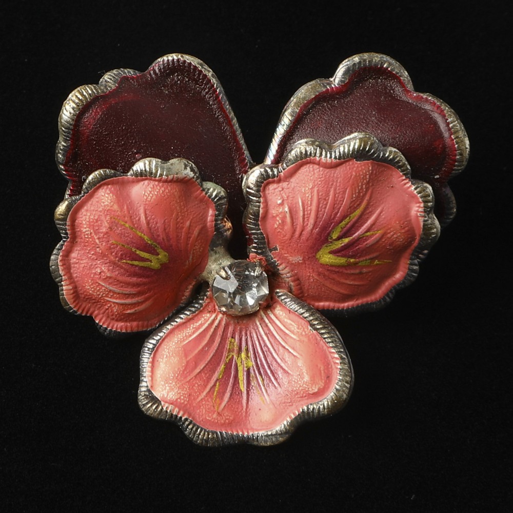 こちらは100年古いアンティーク・ブローチ。パンジーがそのままブローチになった大変キュートなノスタルジックなお品です。周辺に銀彩、中央にクリスタルカットガラス、また色付けはハンドペイントで、手作りの温かみ懐かしさが感じられるアンティーク。100年古いお品です。販売用のカードにつけられたままのデッドストックです。ピンの状態も良好です。全体に経年の風合いがあります。