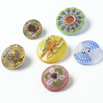 こちらはバーボフカで長年集めてきたガラスボタンを六個セットにしたものです。一番古いボタンは鱗模様のブルーのペイントが施された磨りガラスのボタン、こちらは大変モダンなデザインですが100年古いアンティークです。その他、ピンクやブルーの不透明ガラスを使用したペイントの楽しいヴィンテージのガラスボタン。チェコでもほぼ入手できない大変貴重なお品です。状態もそれぞれとても良いものです。