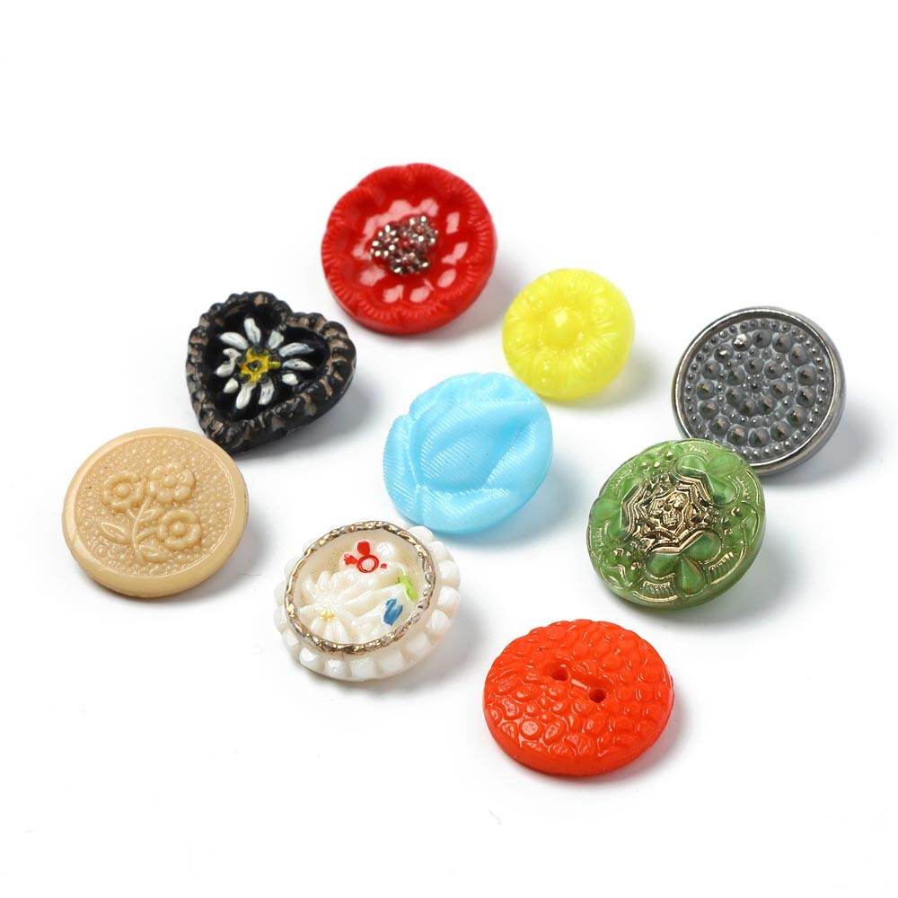 こちらはバーボフカで長年集めてきたガラスボタンを9個セットにしたものです。1920年台から1960年代までの古いボタンをセットにしました。デザインもガラスの色もさまざまな楽しいガラスボタンのセットです。ペイントが剥がれているものもありますので、写真でご確認の上ご注文くださいませ。