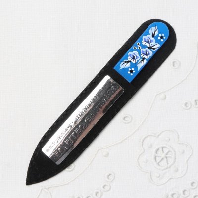 こちらはチェコの工芸品のひとつ、ガラス製の爪やすりです。チェコの大ヒット商品といっても過言ではない、知る人ぞ知る世界中の女子に愛されるアイテムです。表面が磨りガラスの加工が施されていて、その面を研磨部分として使います。普通のやすりより細かな爪の研磨が可能で、研磨後の爪の先はとても滑らかになります。店長横山も個人的に日常に愛用しております。一度使うと手放せない優れものです。こちらのやすりは丁寧に手描きでお花のイラストが描かれ、スワロフスキーエレメントのカットガラスで装飾されています。小さいけれどキラキラと美しい装飾で見た目もおしゃれなチェコの爪やすりです。プレゼントにもおすすめです。