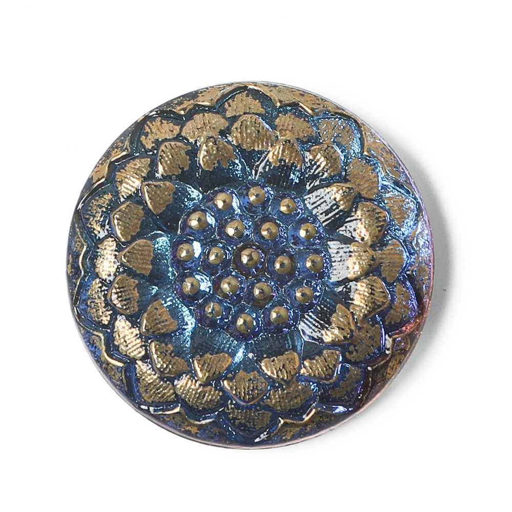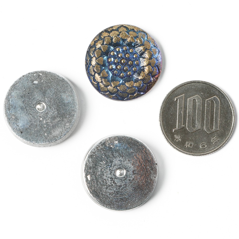 こちらはチェコのガラスボタン工房からのガラスボタン。厚みのある2.3cmのカボションで、ひまわりのモチーフのものです。裏から金属塗料が塗布され、奥行きのあるブルーのお色です。角度によって少しピンクや紫のニュアンスもあります。アクセサリーの材料などにおすすめです。