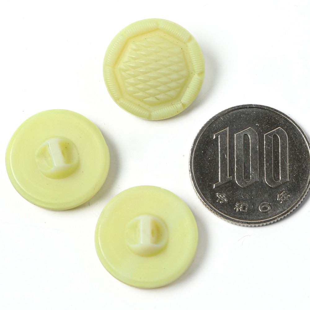 こちらはかつてのガラスボタン工房から直接譲っていただいたヴィンテージのガラスボタン。マットで不透明の今では貴重なイエローのガラスを使用したものです。ひまわりのようなデザインのキュート&レトロなガラスボタンです。現行では手に入らない貴重なお品です。