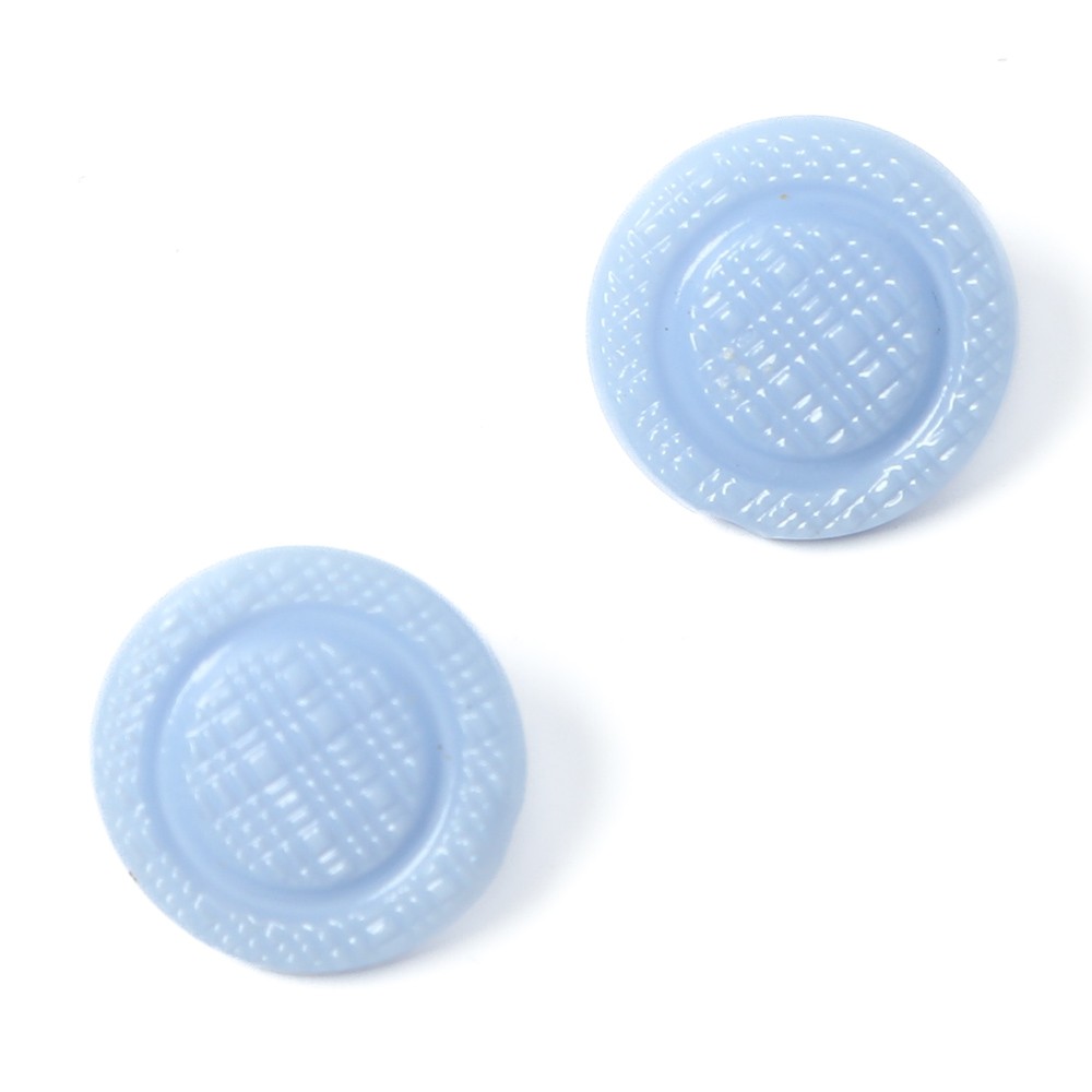 こちらはかつてのガラスボタン工房から直接譲っていただいたヴィンテージのガラスボタン。今では貴重な水色の不透明ガラスを使用したものです。表面には布目のような模様が入ったレトロな雰囲気が素敵なボタンです。現行では手に入らない貴重なお品です。2つセットのお値段です。