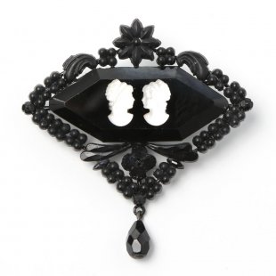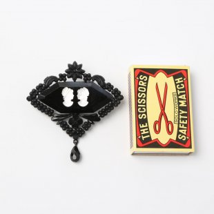 こちらはチェコならではのブラックビジューと呼ばれるアクセサリー。とても大きいジェットガラスのブローチです。素材のジェットガラスは、イギリス18世紀に流行したビクトリアン・ジェット・ジュエリーのジェット(1億8,000万年前のジュラ紀の流木の化石を使ったコンポネント)を模して作った黒ガラスのことです。19世紀後半にヨーロッパで大変流行したジェットジュエリーですが、ガラスの国、さすがチェコ、チェコではその当時、黒ガラスを用いて独自のブラック・ビジューが作られました。現在ではジェットと呼ばれる黒ガラスの製作は途絶え、長い間廃れていたこのブラックビジューですが、北チェコ地方で、その当時の古いパーツのデッドストックを使い、昔ながらの製法で復刻を制作している男性がいます。こちらはそのオリジナルブラック・ビジューのブローチ。5.8cmととても大きくブローチ自体の重量は15gあります。もちろんスタイルはビクトリアン。シックで上品、大胆で印象的。かしこまった場所でも十分お使い頂ける気品あるビジューです。大きなガラス石の表面には、シャイニーホワイトのガラスのカメオが2つデュオで付いているデザインの珍しいものです。パーツは100年前後の古いものを使用していますので、表面に若干ですが擦れやムラがあります。気になるほどではありませんが、パーツ自体はアンティークということをご留意の上お求めください。化粧箱に入れて発送いたします。なお上記記載の重量38gは化粧箱を含めた重量です。