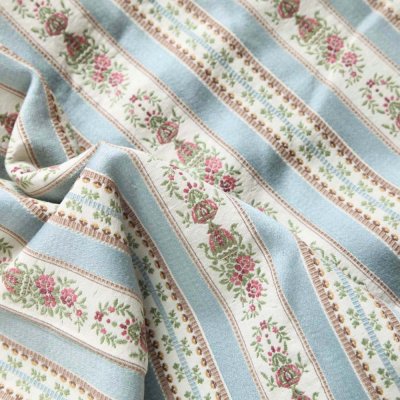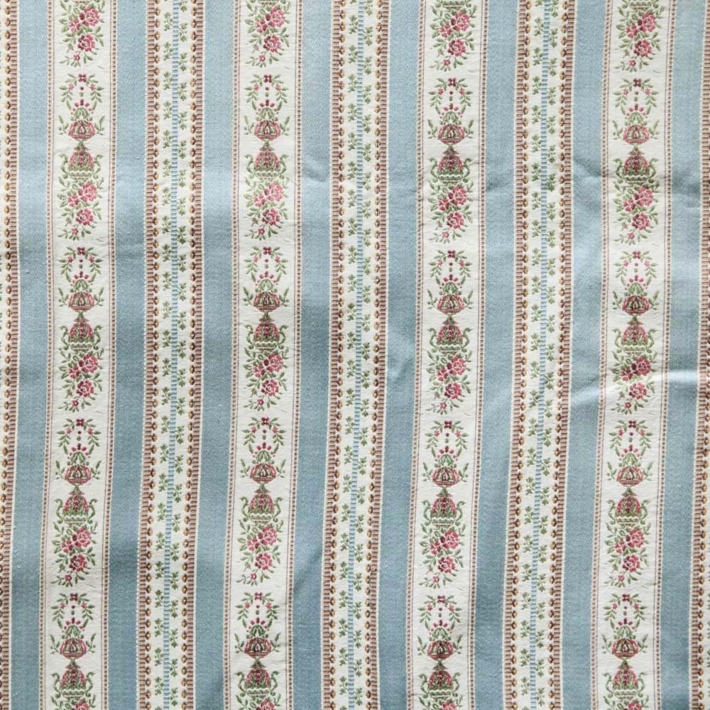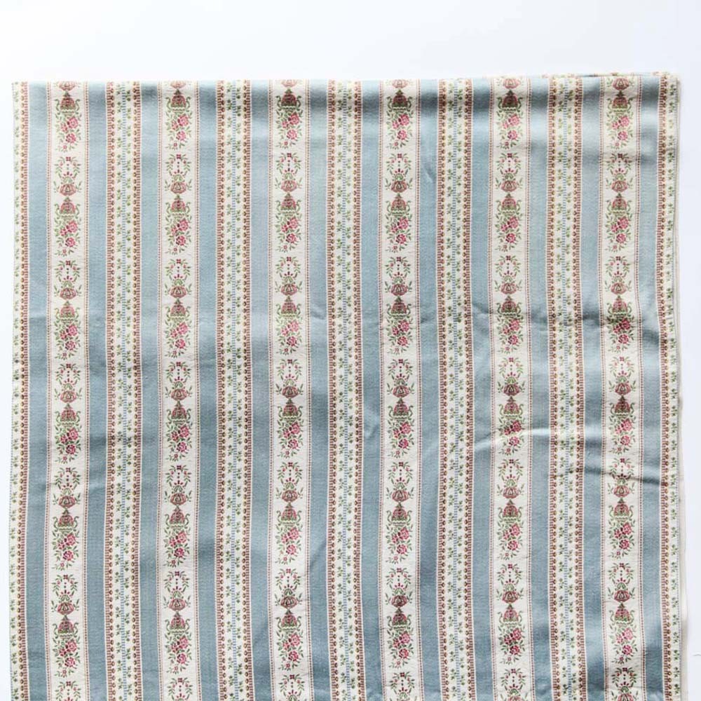 こちらはチェコのご家庭に眠っていた古いゴブラン織りのお布。20年ぐらい前チェコのおばあさまから譲り受けたものです。ゴブラン織りとはもともとパリのゴブラン工房で製造されたものをさしますが、そのスタイルや織りの製法が普及し、スタイル全体をさす様になりました。ヨーロッパでソファーなどの張り布に頻繁に使われる厚手の織物です。こちらはストライプの縞ゴブランと呼ばれるもの。水色とグリーンの合間といえるような色のヨーロピアンスタイルのストライプです。花瓶挿された薔薇の花や蔦模様が刺繍された品のいい落ち着いたスタイル。かつてお部屋の仕切りとして短い期間だけ使われていたものをほどいて長い間保存していたそうです。布の耳のところにほどいた時の糸がついている箇所があります。布は130cmの幅広、ただ布の端に若干ですが色あせが見られます。(布の中央の方が色味が少し濃いめです。)表面に柔らかい光沢があり高級感があります。状態は古いものですが、ほつれや傷みはなく状態は良いものです。洗濯済みです。たっぷり量がありますので、ソファーのカバーや塩ビのシートの下に敷いてテーブルクロスのように使用したり、パーテーションなどにもおすすめです。アイディア次第で素敵なインテリアの材料になります。