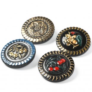 バーボフカのコレクションの中からのご紹介です。大きな3.2cmの黒いガラスを使用したガラスボタンで、表面にはさくらんぼや植物の模様が施されたもので、デザインやペイントの異なるものを4つセットにいたしました。周辺にはゴールドやブルーのペイントが施されています。こちらは2つの型を使用して制作する特にこまのかかっているボタンで、バーボフカでは在庫もひとつずつしかありません。昔懐かしい雰囲気が可愛らしいガラスボタンです。手作りの雰囲気も楽しめます。髪留め、帯どめ、留め具、ブローチなど、使い方はアイディア次第でいろいろです。