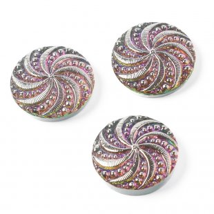 こちらはチェコのガラスボタン工房からのカボション。渦巻きの模様のカボションで、裏から金属塗料が塗布されペールパープルのお色です。ほんの少しですがブルーのお色とのグラデーションが入っています。渦の部分はシルバーです。奥行きのある柔らかな透明感が楽しめます。