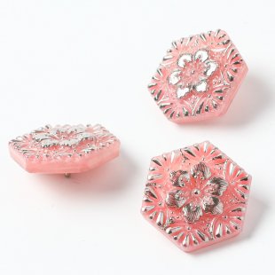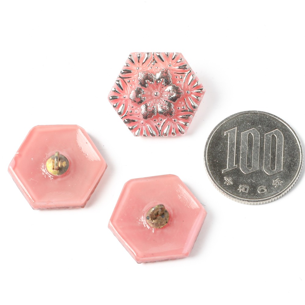 こちらはチェコのガラスボタン工房からの新作。六角形(ヘキサゴン)のフォルムのガラスボタンです。現在では貴重なミルキーピンクのガラスを使用しています。表面には繊細な放射状のお花の模様にシルバーの塗料が施されています。側面はひとつひとつ人の手で研磨され、大変手間のかかっているボタンです。キュートで華やか、他ではなかなか入手困難なお品かと思います。