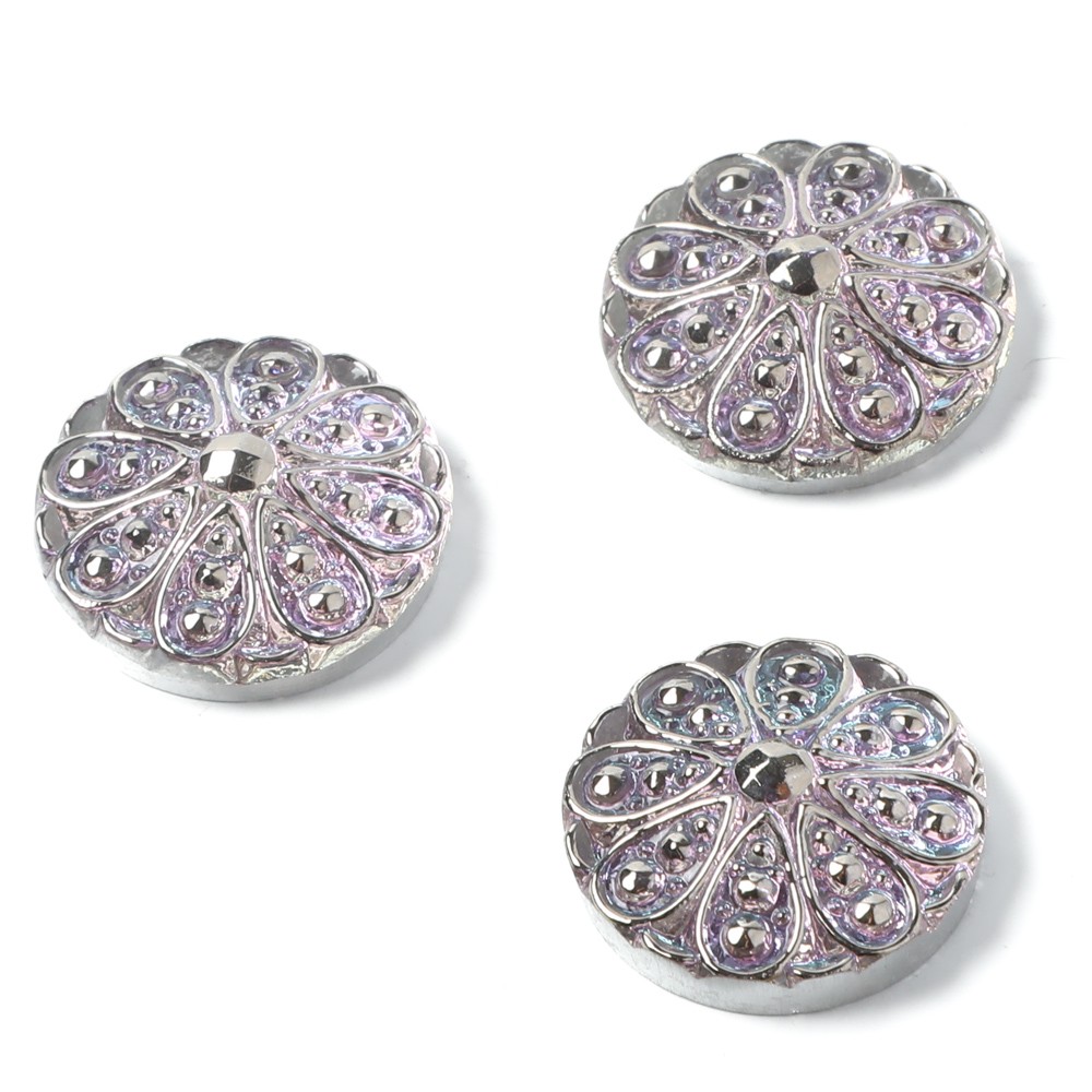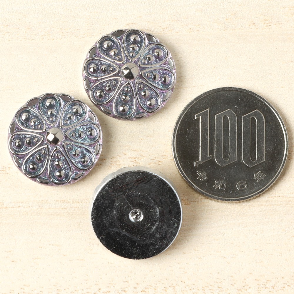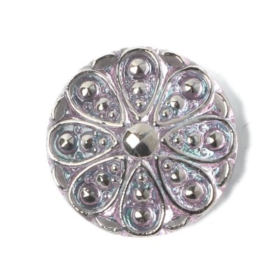 こちらは北チェコのガラスボタン工房で作られている手打ちガラス・カボション。裏から金属塗料が塗布され、奥行きのある美しいヴィトレイルカラーです。今回はお色味が少し薄めの仕上がりです。表面にオプティカルフラワーの細かな模様がシルバーで施されています。柔らかく品のある美しい仕上がりです。お色はエメラルドブルーとピンクが入り混じっている感じで均一のお色ではありませんのでご了承ください。また裏面に極小さな金属塗料の剥がれがあるものがありますが、表からは影響のないものを出荷しております。ご了承の上お求めください。1個売りで御座います。数に限りがございますので、お早めに!