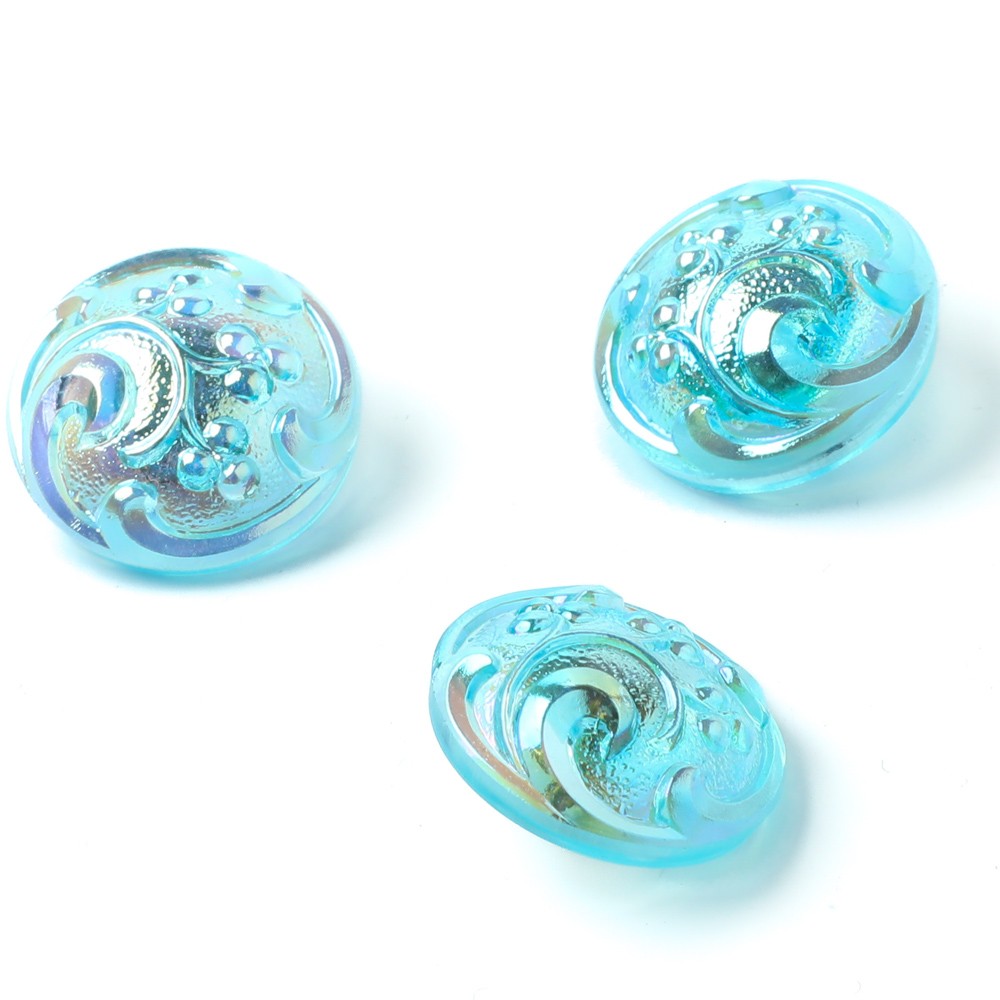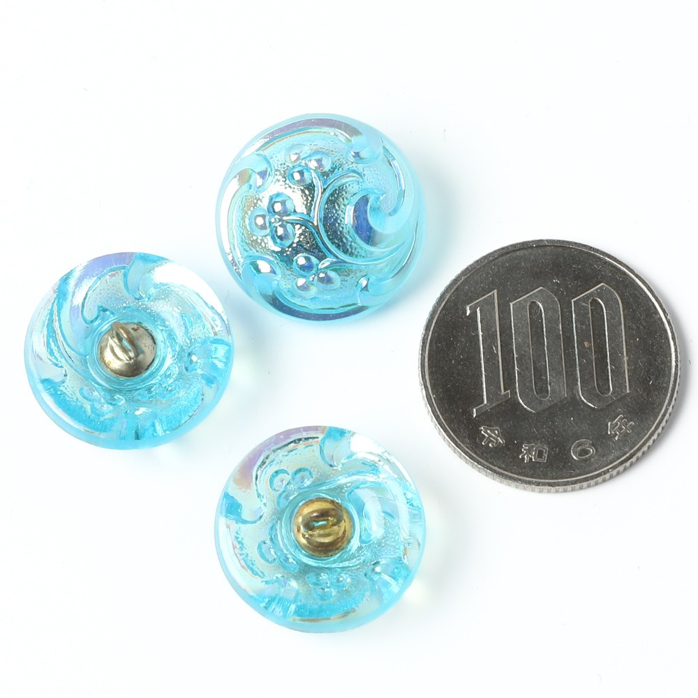 こちらは北チェコのガラスボタン工房で作られている手打ちボタン。直径が約1.8cmのボタンです。こちらのボタンは、透明の水色のガラス製で、中央が盛り上がったポッコリとした形のガラスボタンです。表面にはカーブが特徴的なバロックスタイルの植物モチーフが施されています。また金属塗料が塗布され、メタリックなシャイニーブルーのお色です。優雅で美しい色味に仕上がっています。ブローチのような貫禄と華やかさがあり、アクセサリーの材料としてもおすすめです。