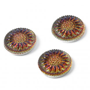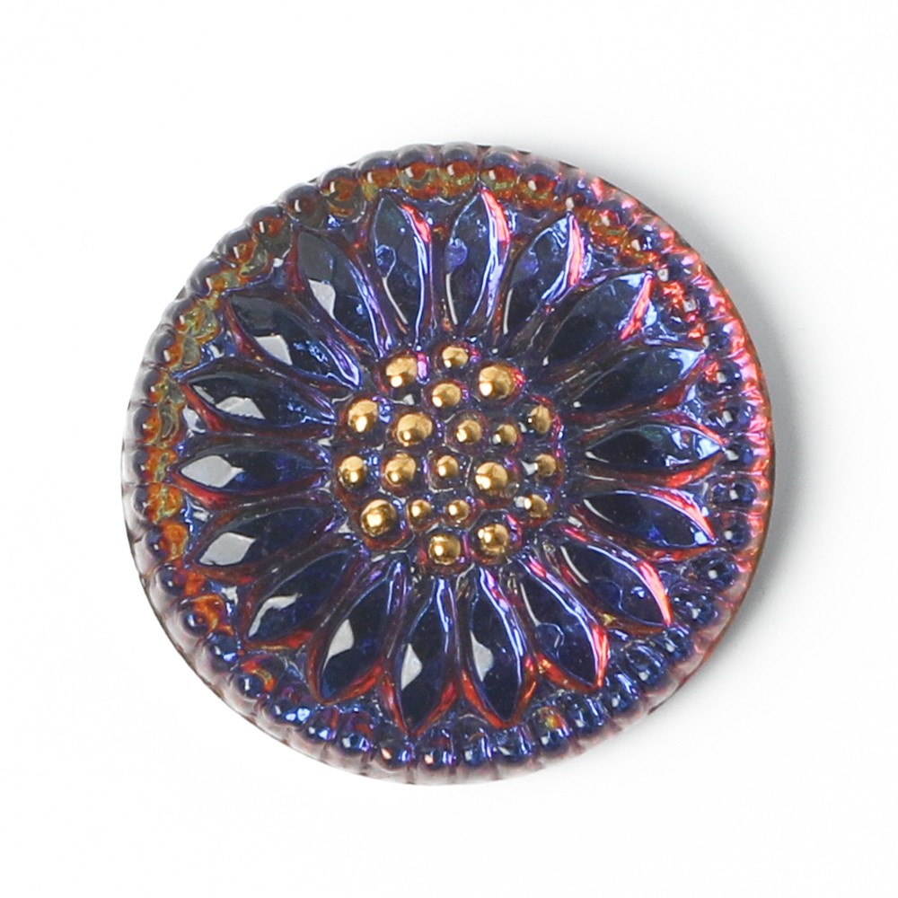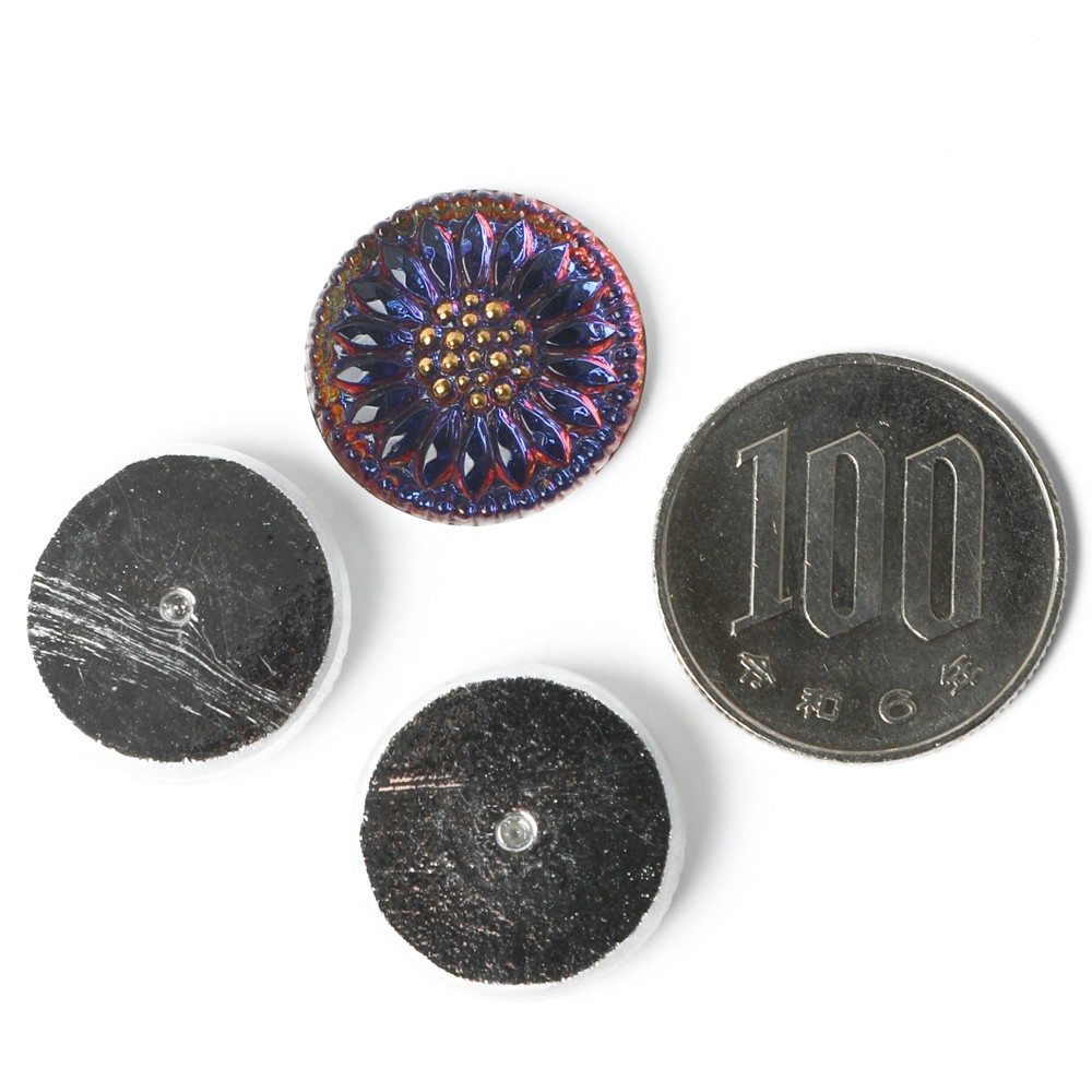 こちらはチェコのガラスボタン工房で製作されている手打ちのガラスカボションです。直径が約1.8cmあります。打ち出しや彩色も職人さんの手作業で行われています。ひなぎくのモチーフで裏から金属塗料が塗布され、奥行きのあるメタリック・ブルー。角度を変えるとピンクやオレンジのカラーも見えます。おしべには手作業で金彩も施され、明るい雰囲気の一品です。複数写っている写真もありますが、こちらは1個での販売になります。こちらはカボションですので、裏面はボタン通しがなく、平らですのでアクセサリー作りの材料としては便利かと思います。
