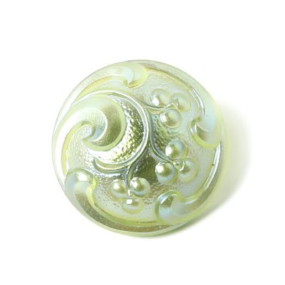 こちらは北チェコのガラスボタン工房で作られている手打ちボタン。直径が約1.8cmのボタンです。こちらのボタンは、透明の黄緑色のガラス製で、中央が盛り上がったポッコリとした形のガラスボタンです。表面にはカーブが特徴的なバロックスタイルの植物モチーフが施されています。また金属塗料が塗布され、メタリックでシャイニーなブルーグリーンのお色です。優雅で美しい色味に仕上がっています。ブローチのような貫禄と華やかさがあり、アクセサリーの材料としてもおすすめです。