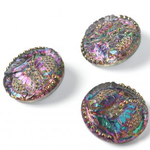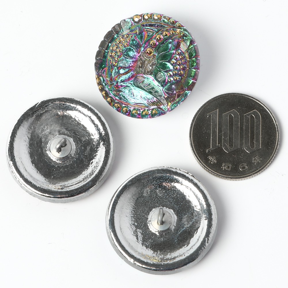 こちらは北チェコで長い間製造されてきたガラスボタンです。こちらのボタンは大きな向日葵のようなお花が2輪、ボタンの表面に所狭しと大きくデザインされています。裏から金属塗料が塗布され、お色はメタリックグリーン&ピンク色のガラスボタン。また表からは金彩で奥行きのある作りになっています。こちらのボタンはガラス本来の質感の楽しめる涼やかな印象のボタンで華やかさもあります。留め具や帯留め、アクセサリーなどにもおすすめです。