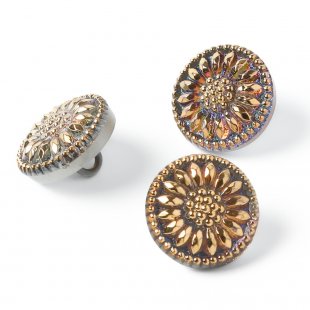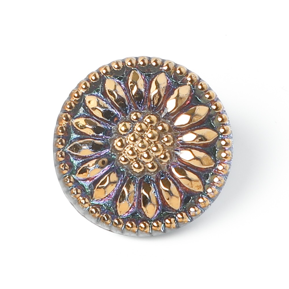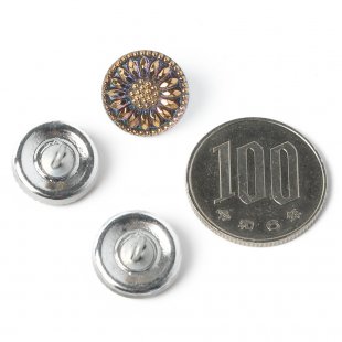 人気のひなぎくのデザインのガラスボタン。直径は1.3cmの小さなボタンです。裏面に金属塗料が塗布され、うっすらパープルのお色に仕上がっています。表面のゴールドのペイントの合間からほんの少し、そのパープルのお色が見え隠れします。小さいけれど華やかなボタンです。
