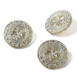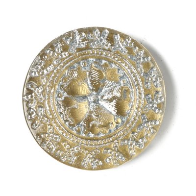 ガラスボタン工房で作られている手打ちガラスボタン。直径約2.3cm。一つ一つ打ち出しや彩色も職人さんの手作業で行われるガラスボタンです。表面にはリースやお花の細かな模様が施され、裏からマットゴールドの金属塗料が塗布されています。表面には模様の中にマットホワイトの塗料も入れ込まれ、柔らかいコントラストが綺麗です。上品で華やかな雰囲気があります。女性らしいフェミニンな一品です。一つひとつハンドペイントで丁寧に制作されたガラスボタンです。人気の再入荷のお品です。