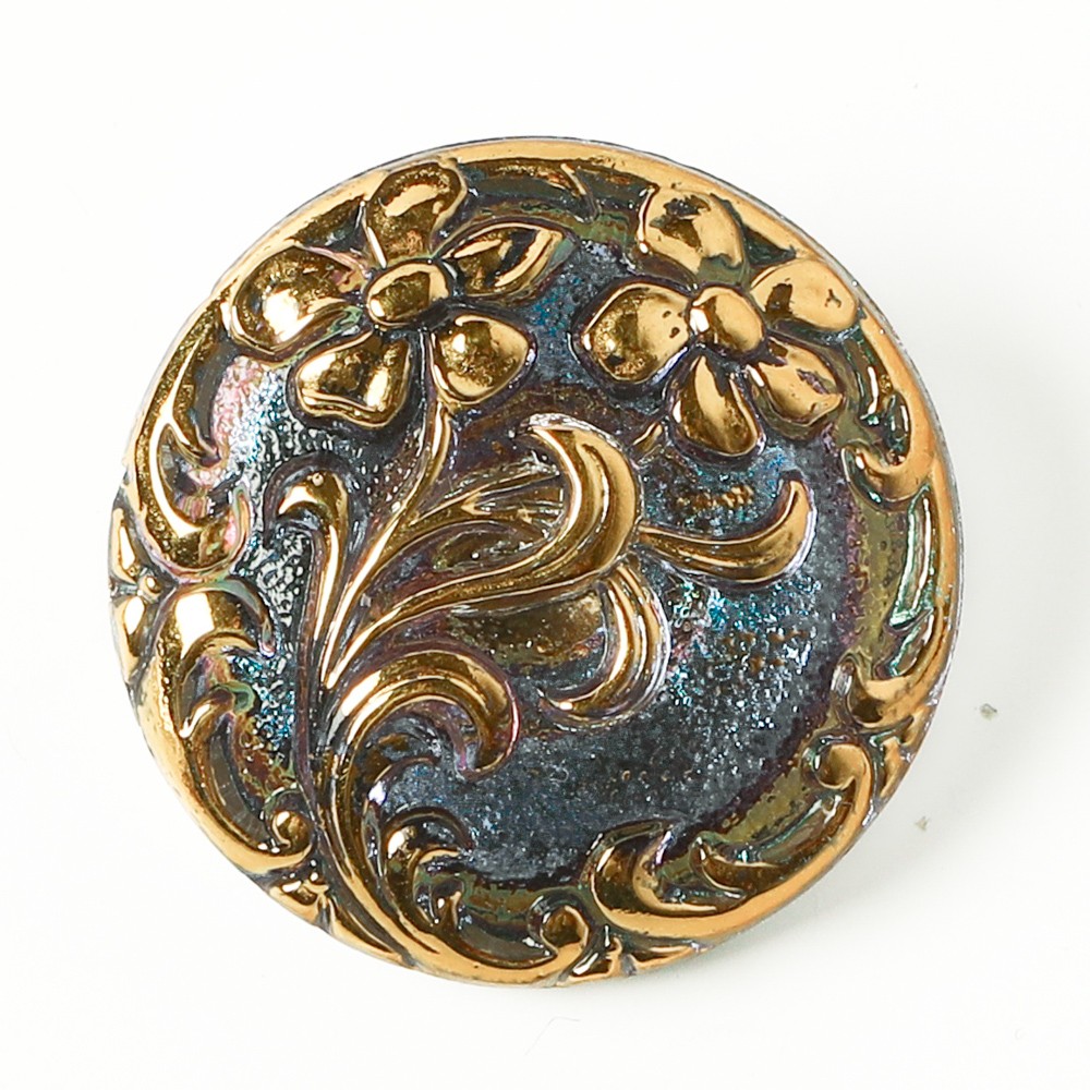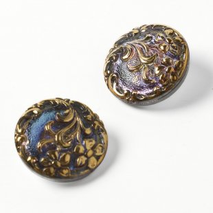 こちらは北チェコのガラスボタン工房で作られている手打ちボタン。直径が約2.3cmのボタンです。透明のガラスを使用し、表面にはバロックスタイルを思わせる優雅な植物文様が入っています。裏から金属塗料が塗布されていて、内側から深い青色をしたシックな雰囲気のガラスボタンです。角度により紫のお色なども見えます。表面はモチーフに金彩が施され豪華なボタンに仕上がっています。アクセサリーに作り変えるもの、お洋服のボタンにするのもおすすめです。