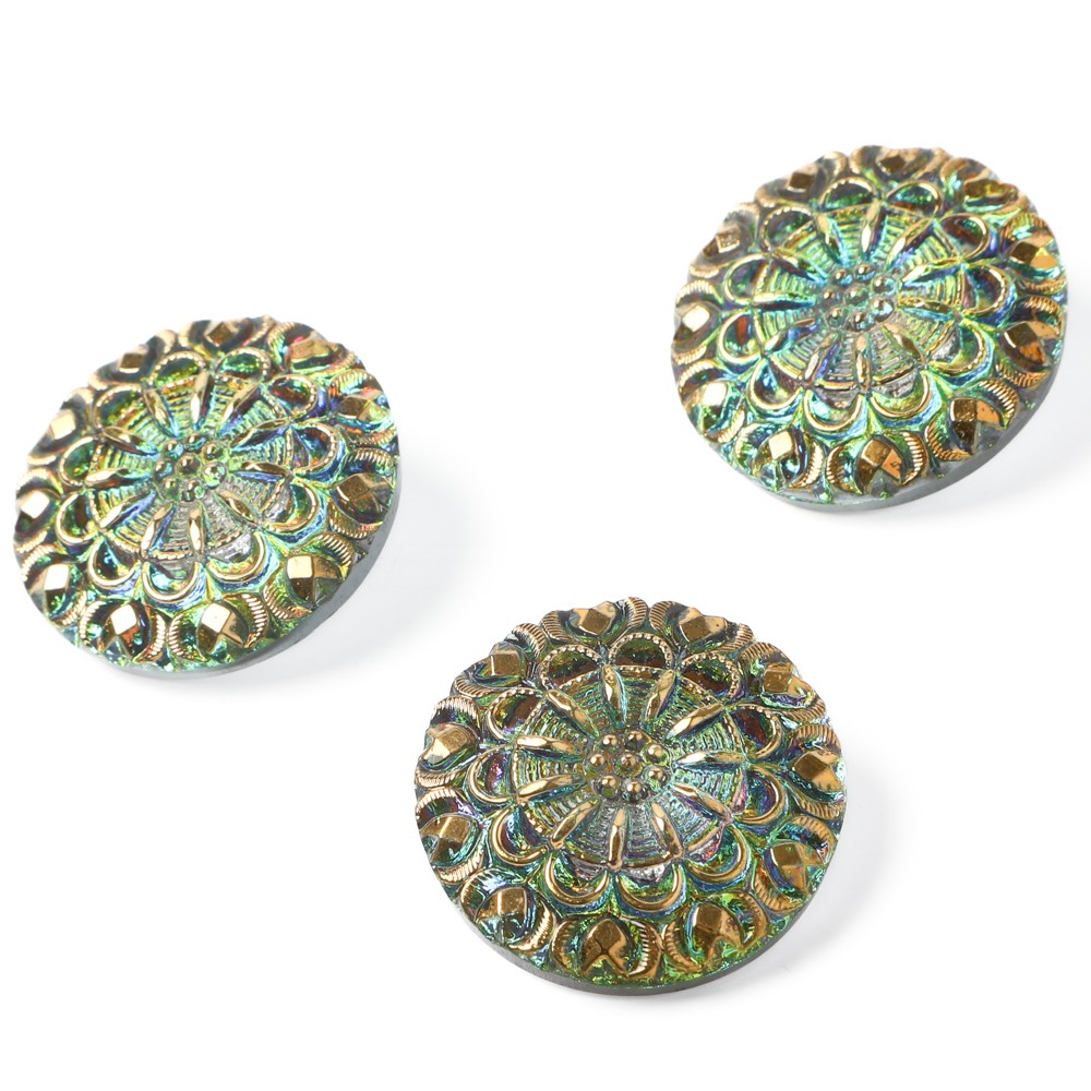 こちらは直径2.7cmのガラスボタンです。裏面から金属塗料が塗布され、淡いグリーンの美しい輝きがあります。表面には金属塗料が塗布されていて、花火のような繊細な花模様で、よく見るとハートのマークも隠れていて、華やかでキュートなガラスボタンです。角度によりピンクのお色も見え隠れします。