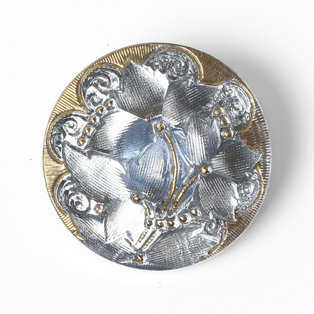 こちらは北チェコの豪華手打ちガラスボタン。桔梗の花のモチーフ、彩色も手作業で行われていて工芸品としての豪華ガラスボタンです。直径は2.7cmで裏から金属塗料で塗布され、奥行きのある涼やかなクリアブルーの輝き。表面に金彩も施され、華やかでクールなガラスボタンに仕上がっています。ブローチのような存在感ですのでお裁縫のマテリアルとしても、飾りボタンとしても素敵です。髪留めや帯留めに加工するなど、アイディア次第で楽しみ方は色々です。こちらのボタンのお色の濃淡に若干の個体差がございます。