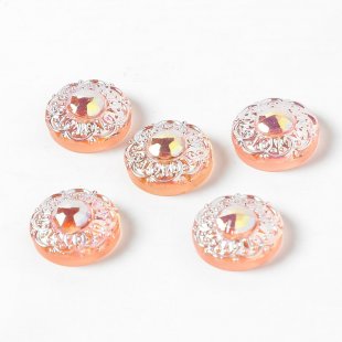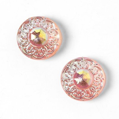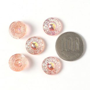 ガラスボタン工房で作られている手打ちのガラス・カボションです。こちらカボションはガラスボタン工房のデザインでバーボフカが特別に発注したお色です。直径は約1.3cmあります。透明ピンクの貴重なガラスを使用したお花のデザインの素敵なカボションで、表面にはうっすらと金属塗料が塗布されているため、キラキラと美しい輝き。フェミニンなガラスカボションに仕上がっております。現地チェコからのとっておきです。2個での販売です。裏には糸通しのリングがないため、アクセ・パーツとして使用される方には大変便利です。人気の再入荷商品です。