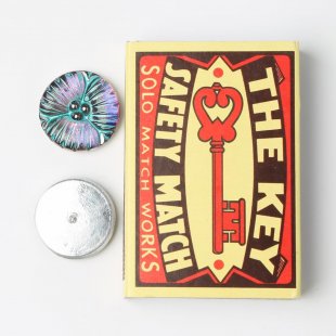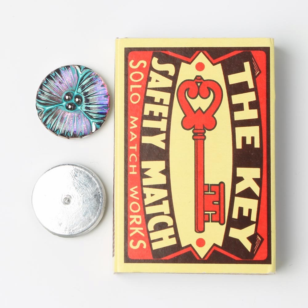 チェコのガラスボタン工房で製作されている手打ちのガラス・カボションです。直径は約1.8cmです。一つ一つ打ち出しや彩色も職人さんの手作業で行われています。裏から金属塗料が塗布されているため、内部に美しい輝きを秘めたカボション・・・。お色はブルー、表面からはターコイズ・ブルーのラインが手彩色で施されています。斜めから見ると燃えるようなサンセットオレンジもお色も見えます。ふくよかなデザインのお花で、雄しべの部分に銀彩も施され上品で華やかです。