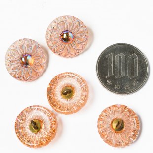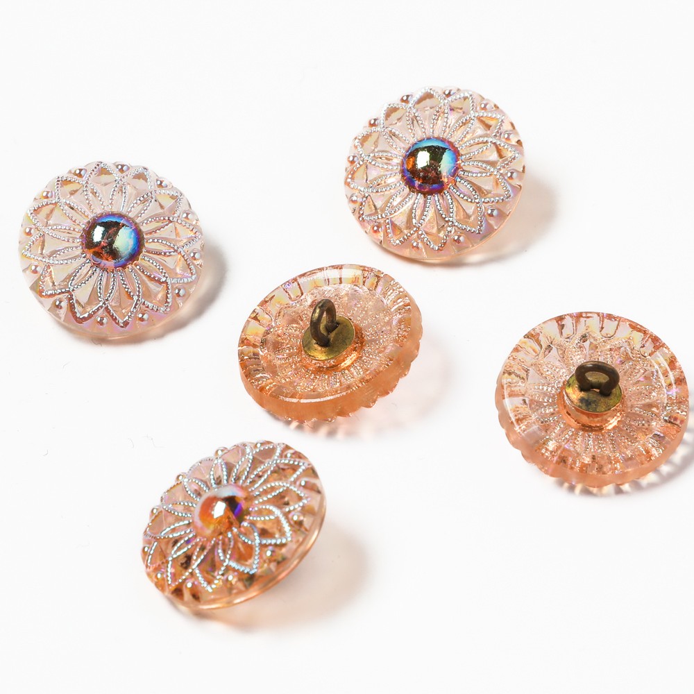 こちらはチェコのガラスボタン工房で製作されている手打ちのガラスボタンです。直径が約1.8cmあります。オレンジ色のニュアンスのあるピンクの透明なガラスを使用したガラスボタンです。表面には薄ら金属塗料が塗布され、オーロラの輝きもあります。また少し昔懐かしい雰囲気もあります。うっとりするようなガーリーな仕上がりです。工房の在庫の中から分けていただいたとっておきです。