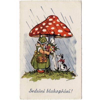 こちらはとても古いキノコのポストカード。お祝い用のカードで、心よりお祝いいたしますと書いてあります。盲目の人を助ける団体が発行した珍しいカード。(金額の一部が寄付されたようです。)色鮮やかな赤いキノコの下で雨宿りをする可愛らしいイラスト。色合いもタッチもレトロな一品で額に入れて飾るのにもおすすめ。