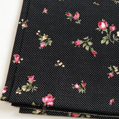 こちらはチェコの新作、黒地に水玉と可憐なバラのお柄の生地。ヨーロッパな雰囲気たっぷりの布です。小さなバラのモチーフが何ともロマンティック。素材は綿100%で平織りのお布です。お裁縫のお供に。